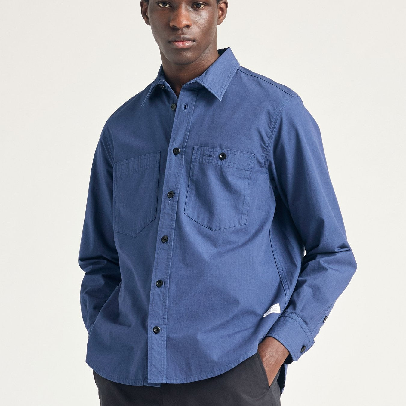 A regular fitting shirt, constructed from an Italian midweight cotton ripstop and garment dyed for a rich colour. Features two chest pockets, box pleat at the back, shaped hem and a branded tab at the front.