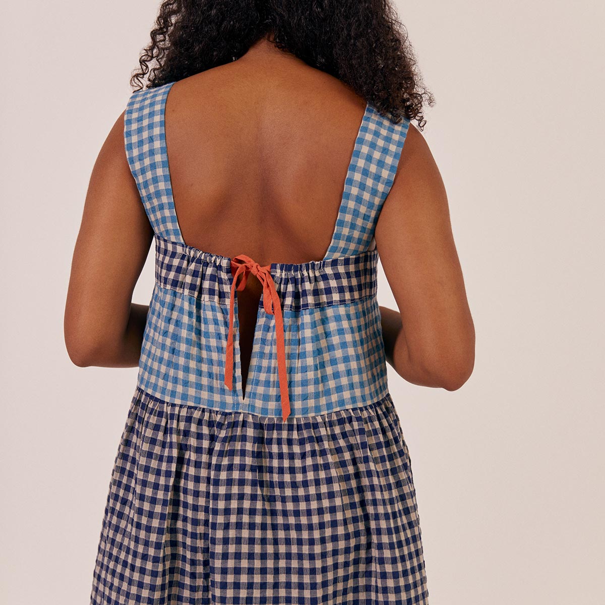 The Beau Dress is crafted from a beautiful linen cotton blend in a textural gingham with two colours of the same fabric patch-worked together.  The silhouette of this style is loose but flattering with a square cut neckline and wide straps.  The Beau Dress also features side pockets and a contrast tie detail at the back.  This dress is a great everyday summer style and also looks lovely layered in cooler weather.