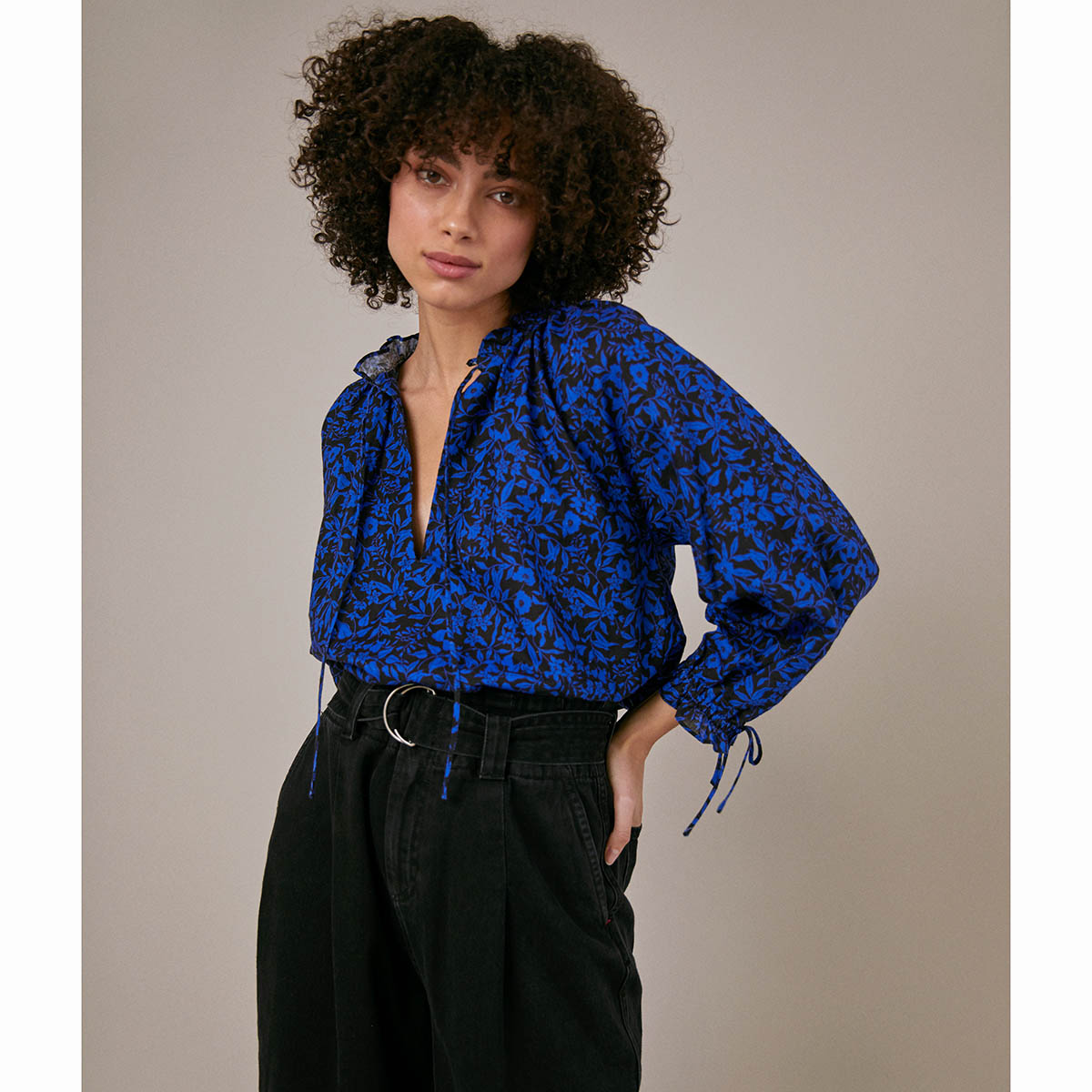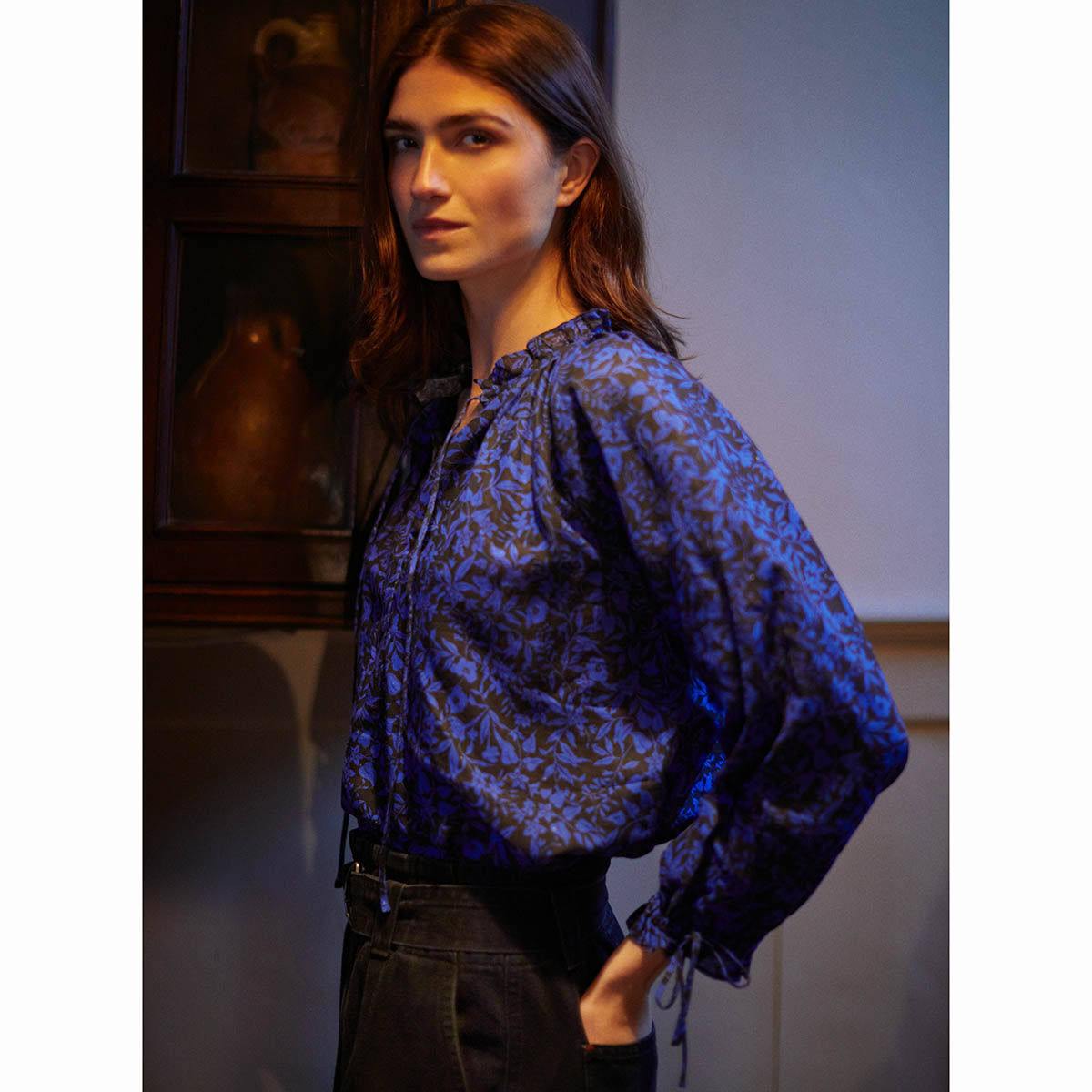 The Betty Top features our seasonal print inspired by the shadows of winter florals.  The base fabric has a lovely softness and drape.  The silhouette of the Betty Top is loose and slightly oversized but still flattering and easy to wear.  This style features a delicate ruffle neckline with an opening and self-fabric tie.  The sleeves are also loose with an elasticated cuff.