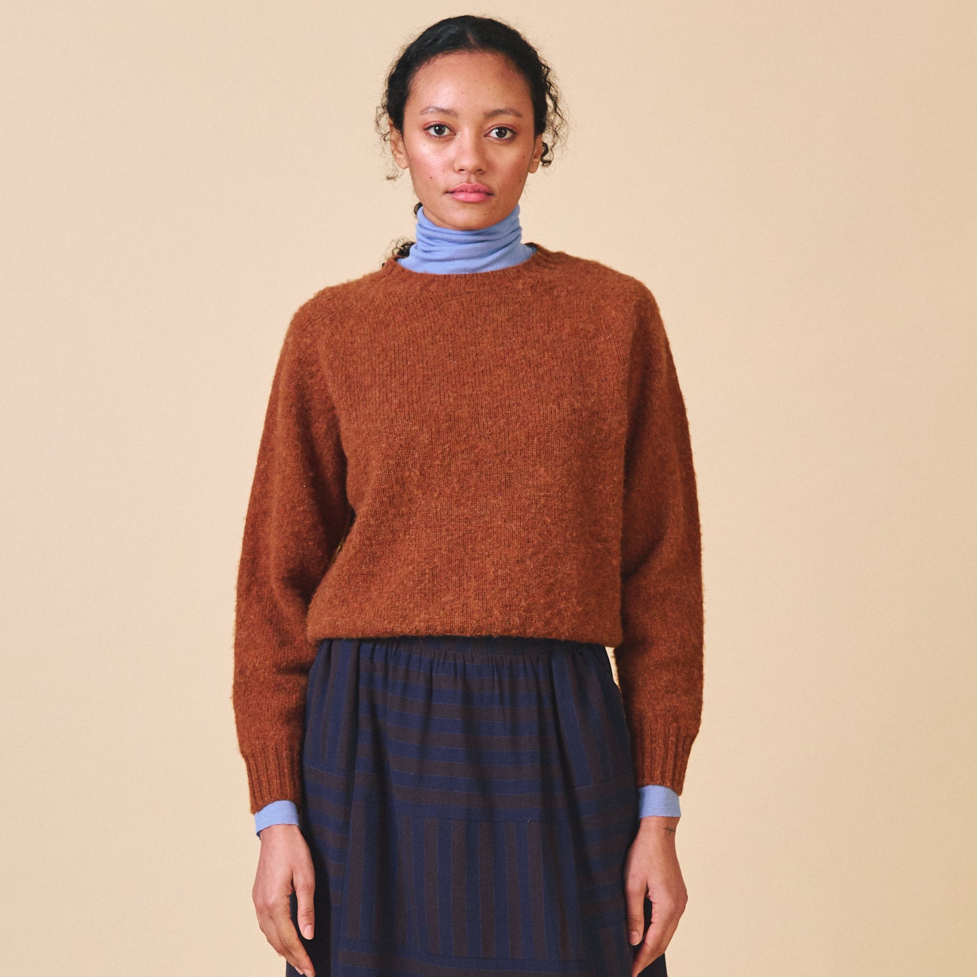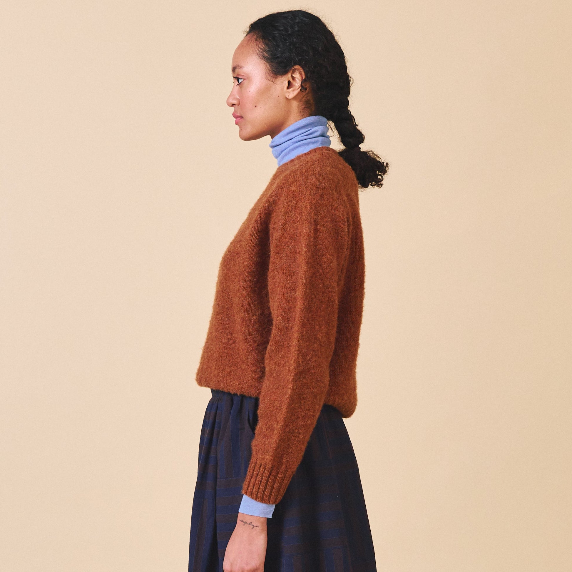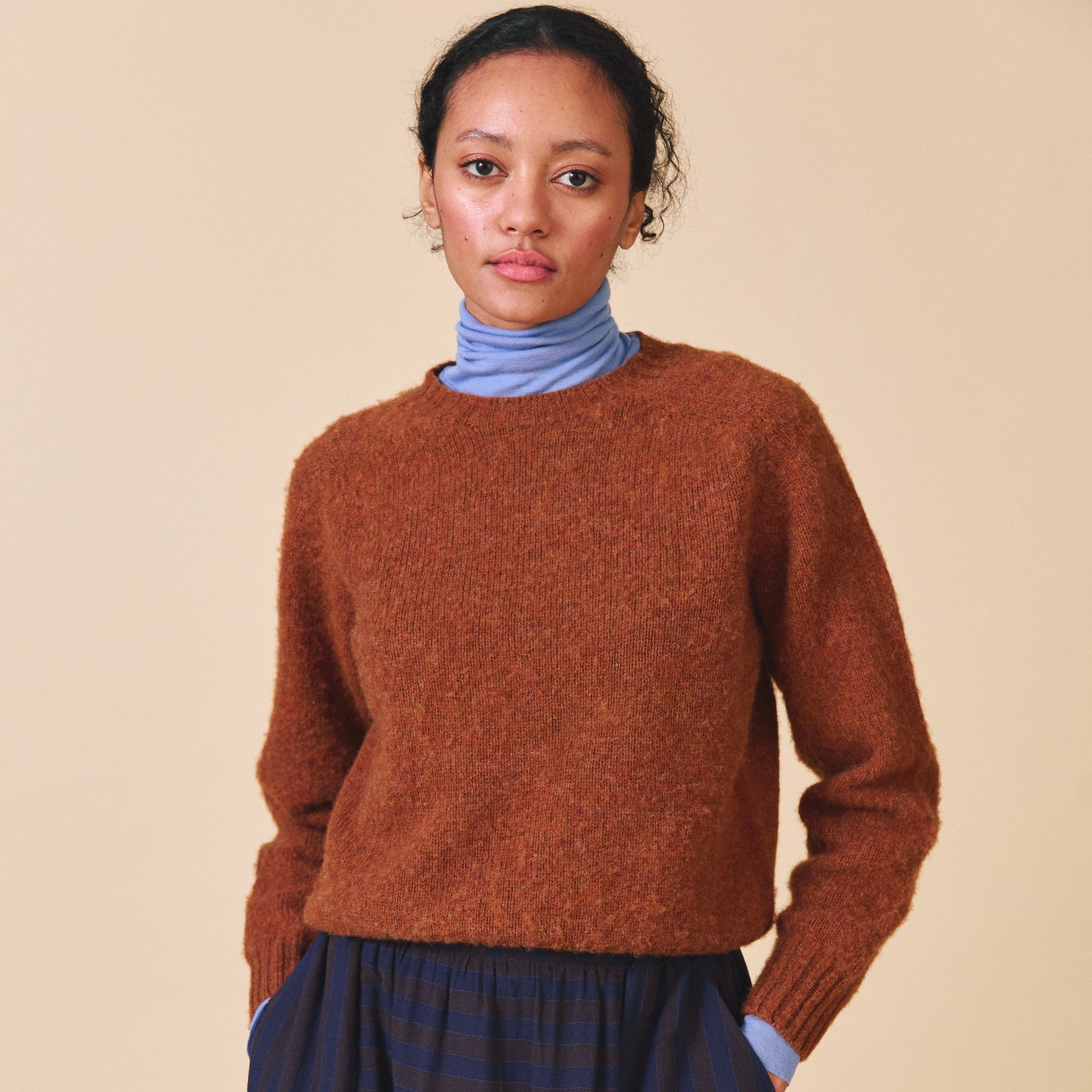 The Nova Jumper is made from 100% wool. This style is made using traditional seam-free knitting machines meaning there no waste is created in the production. The silhouette of this style is slightly boxy, not cropped but sitting just below the waistband. The surface of this style has been brushed giving is a cosy, fuzzy texture. The Nova Jumper fits true to size.