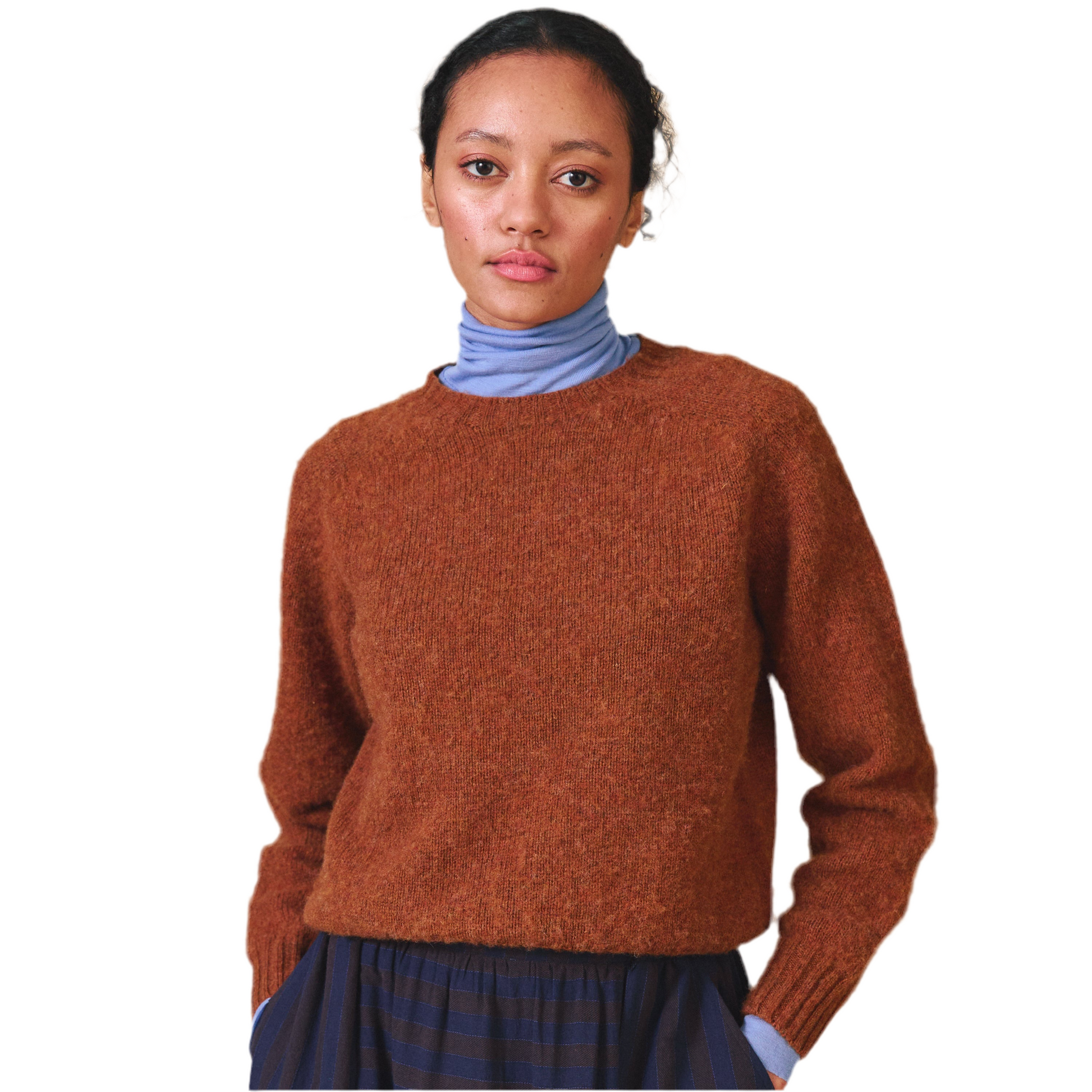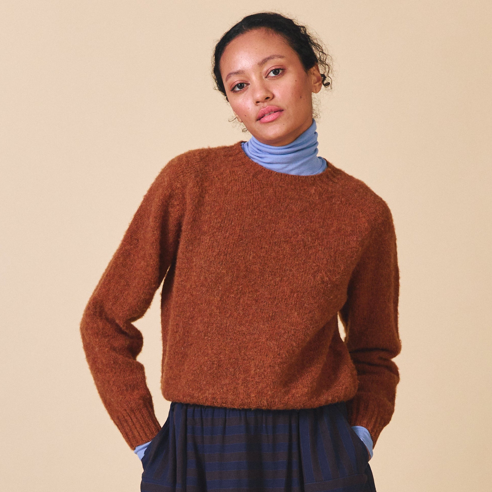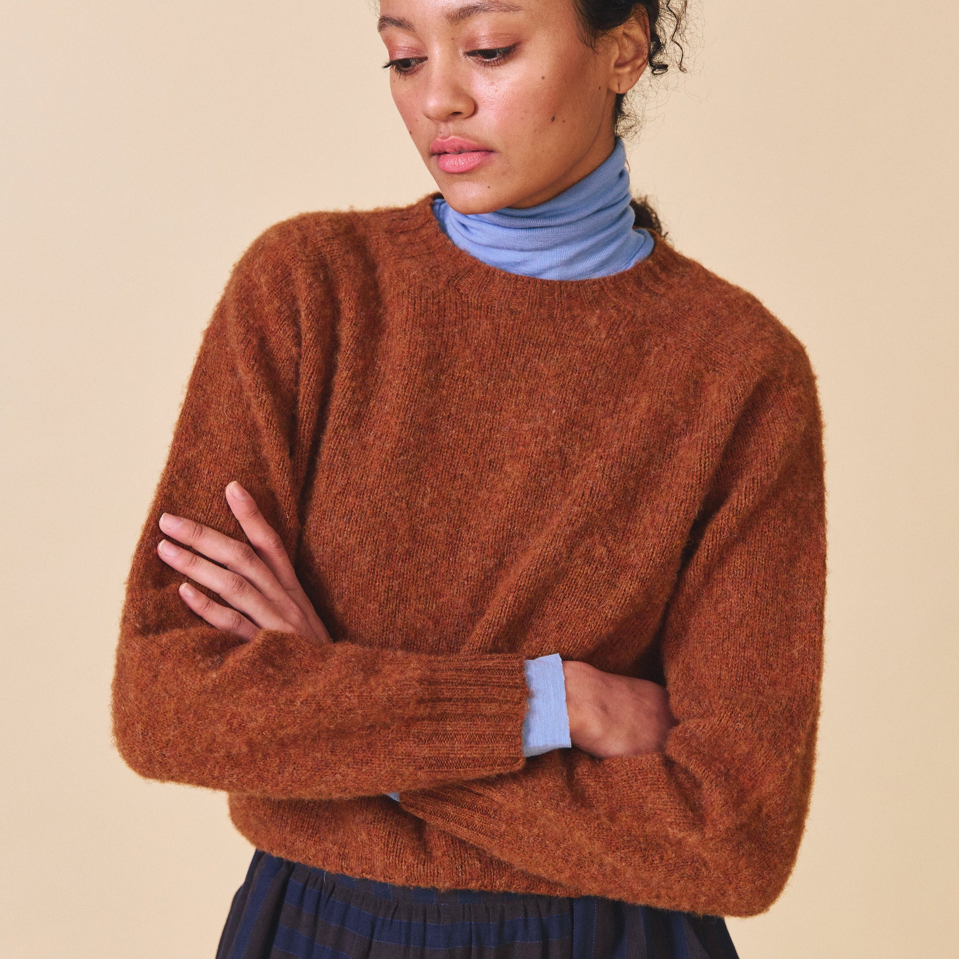 The Nova Jumper is made from 100% wool. This style is made using traditional seam-free knitting machines meaning there no waste is created in the production. The silhouette of this style is slightly boxy, not cropped but sitting just below the waistband. The surface of this style has been brushed giving is a cosy, fuzzy texture. The Nova Jumper fits true to size.