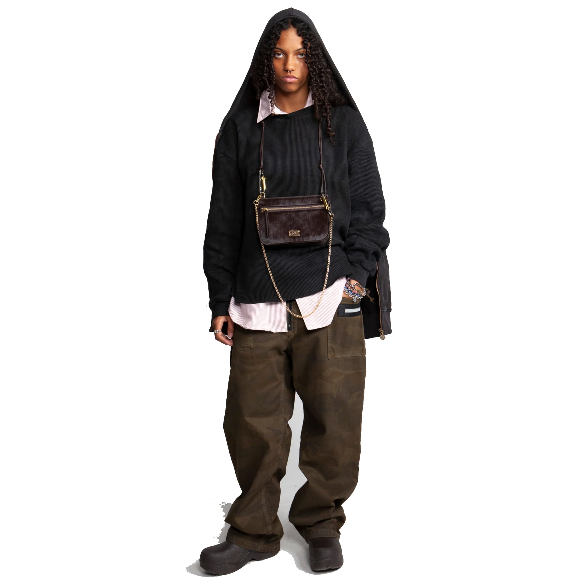 Unisex walking-style trousers with a chunky vislon front zip, velcro side tabs to adjust the waist and zipped side pockets. Made from an all over cylindrically printed camo cotton twill and finished with a garment dye, with an Aries mini carabiner hanging from a loop at the waist