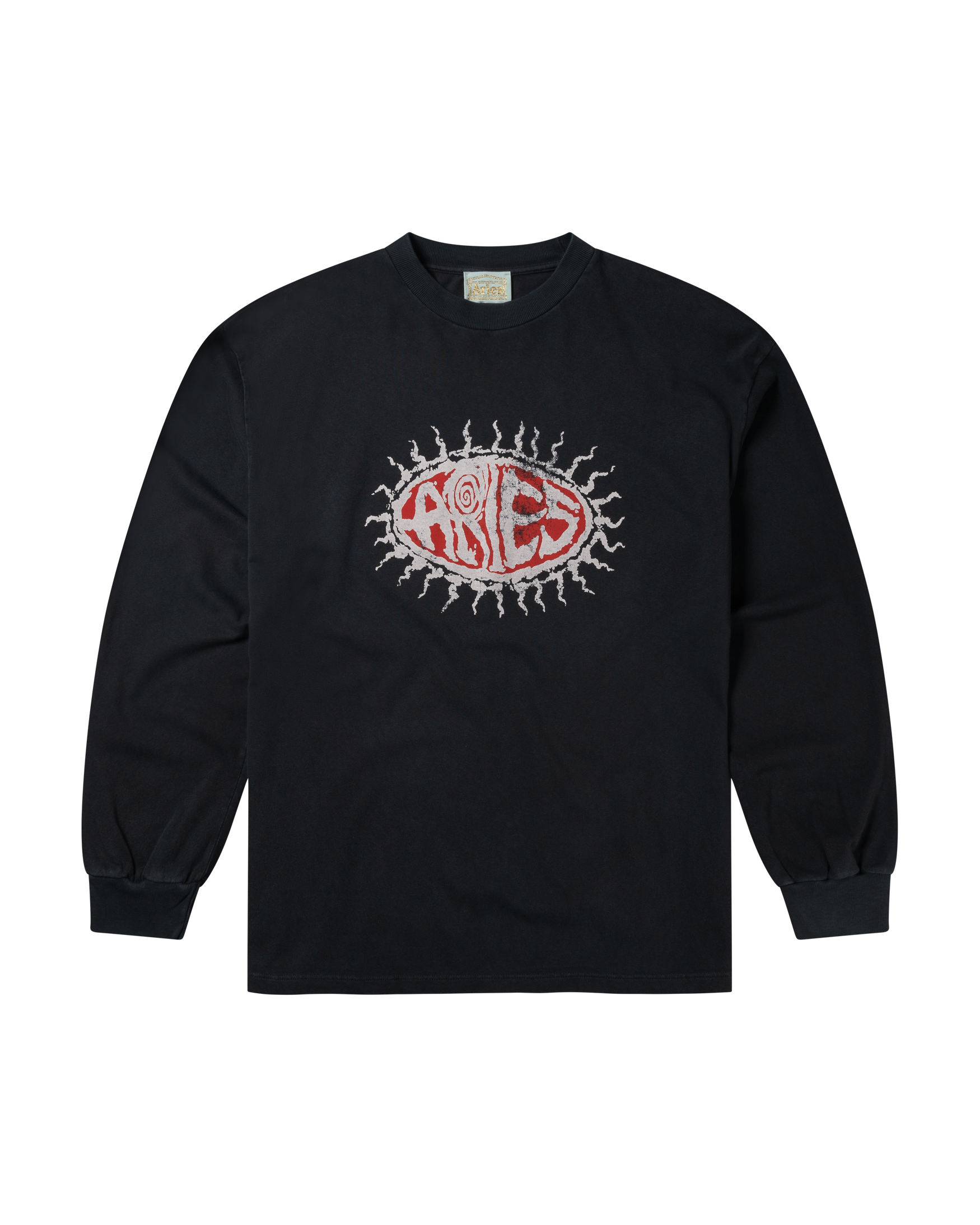 unisex long sleeve t-shirt made from heavy-weight cotton, with aries 'Grunge' graphic screen-printed on the front. finished with a stone wash treatment for a washed out, faded effect.