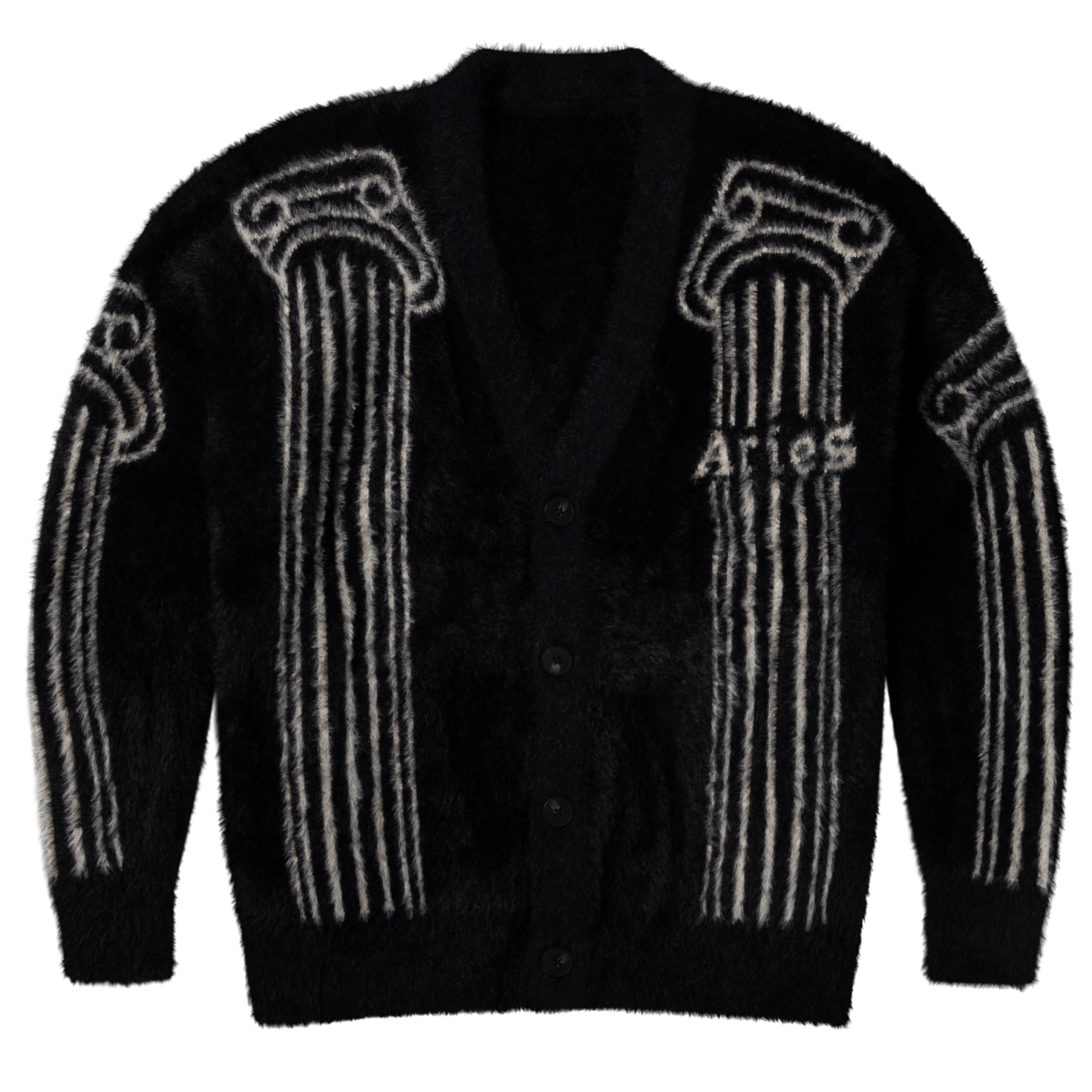 Unisex oversized 7 gauge knit cardigan, made with a fluffy chenille yarn as the main yarn. 2 colour column jacquard design on sleeves, front and back.