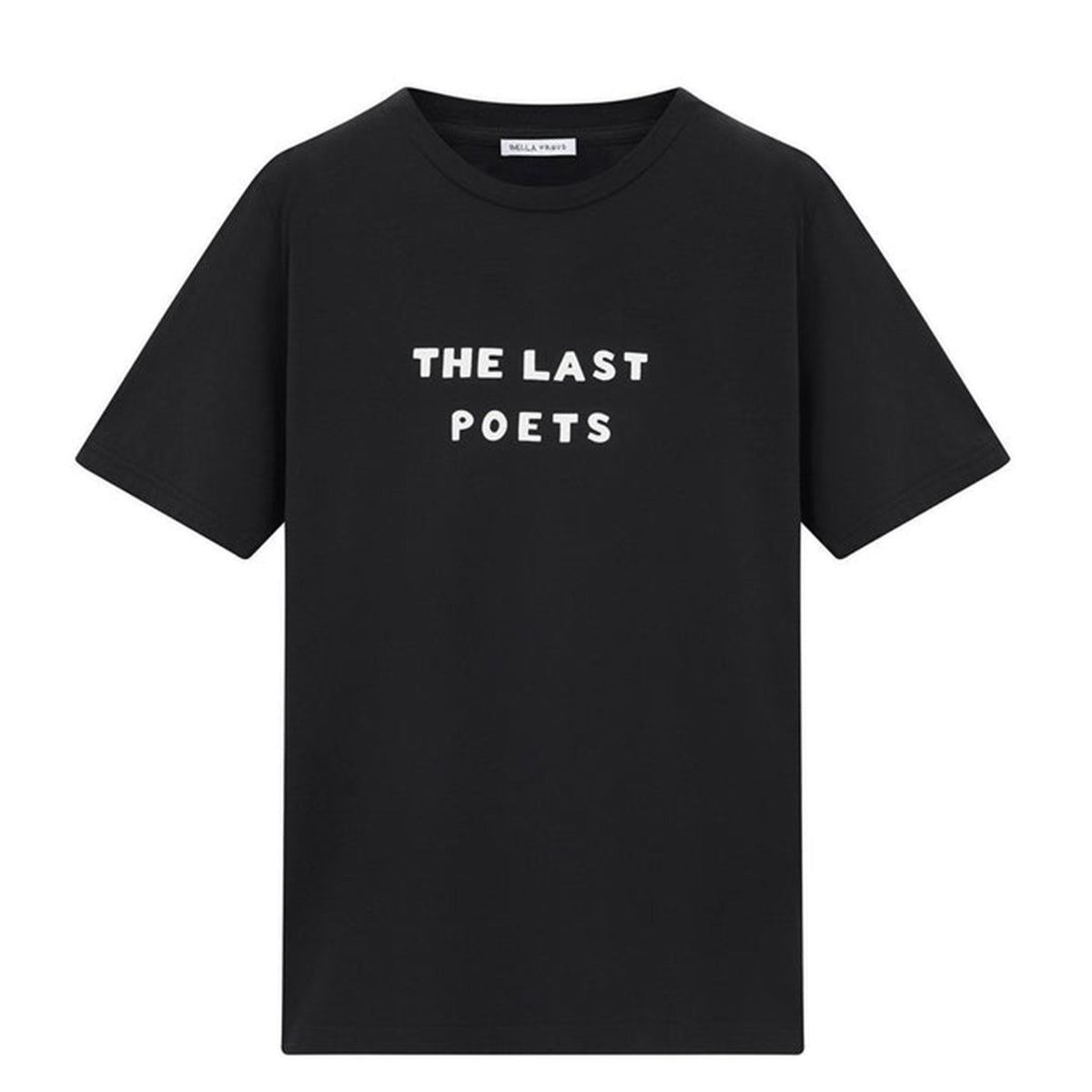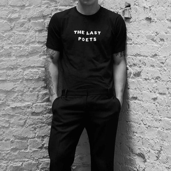 Unisex cotton crew neck T-shirt with 'The Last Poets' print and star on the back neck. Model is size Medium wearing a size Medium, height 6"1.5.