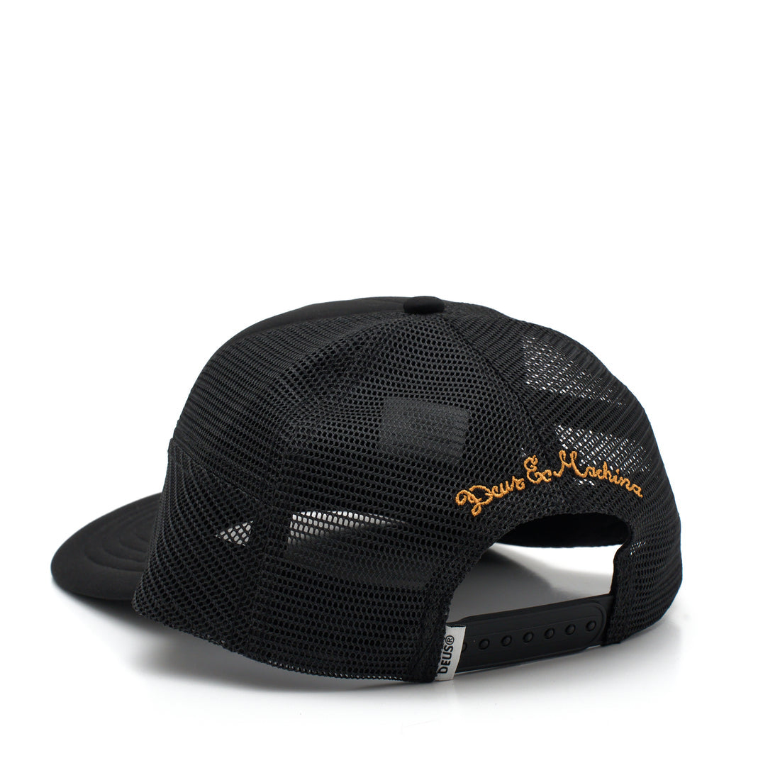 Classic fit tucker hat with front patch artwork, foam padded front panel and visor in a polyester fabrication with a garment wash.