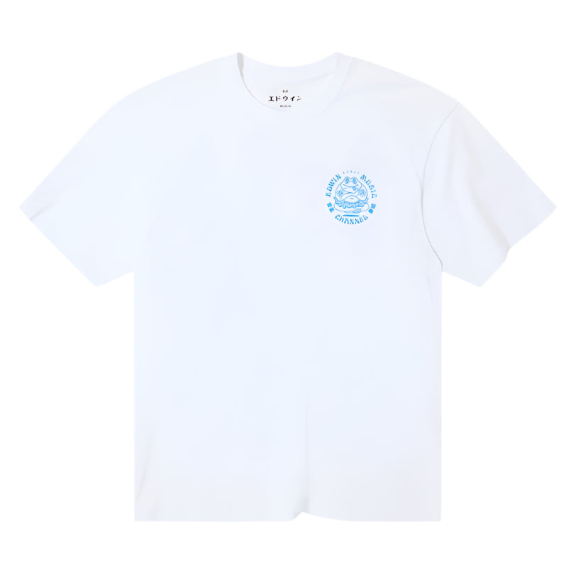 The EDWIN Music Channel T-Shirt is made from 160g/m² single jersey, 100% cotton. It features an oversized fit, graphic prints on both chest and back, and a ribbed collar for added durability and structure.