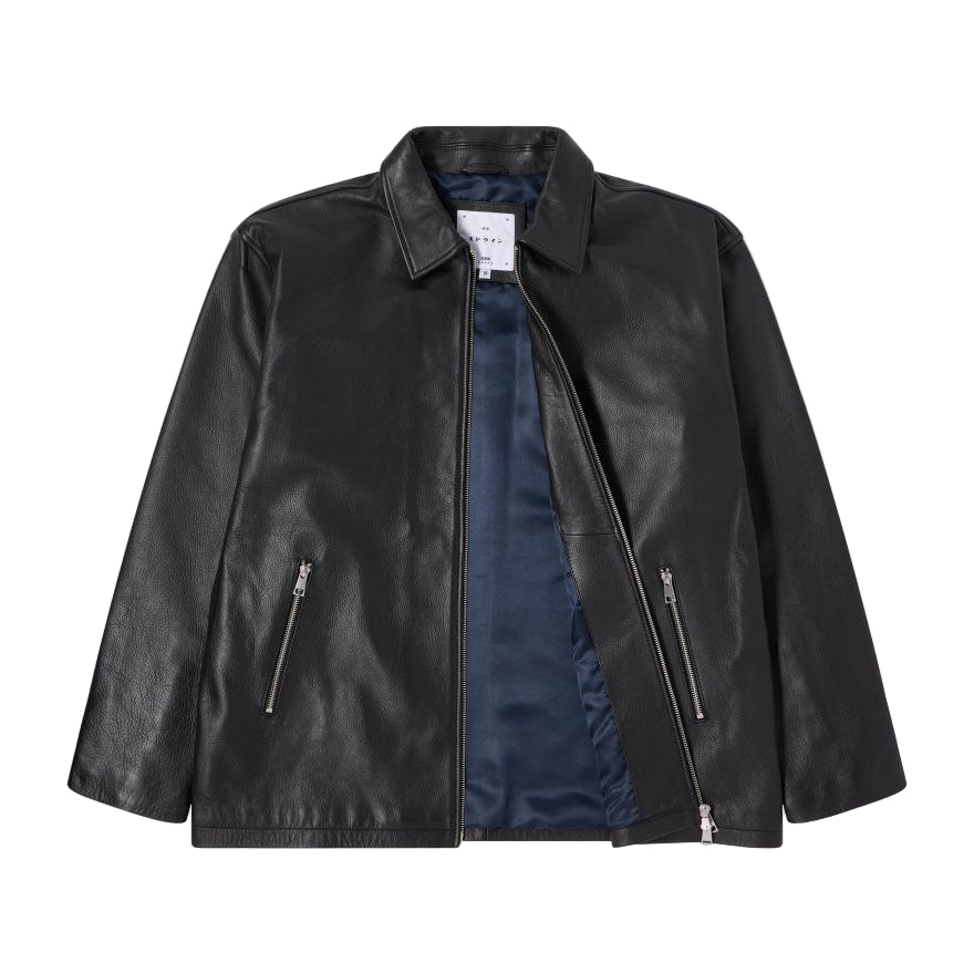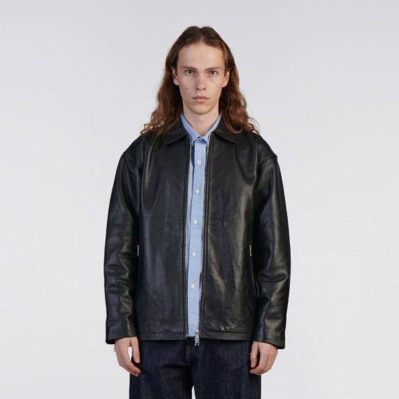 The EDWIN Fix Jacket is an oversized fit jacket made from 0.9/1.0 mm thick 100% cow leather. It features a double way metal zip front closure, two side pockets with metal zip closures, and metal zips on each cuff. Constructed as a leather shirt, it offers durability and structure through high-quality leather and reinforced hardware.