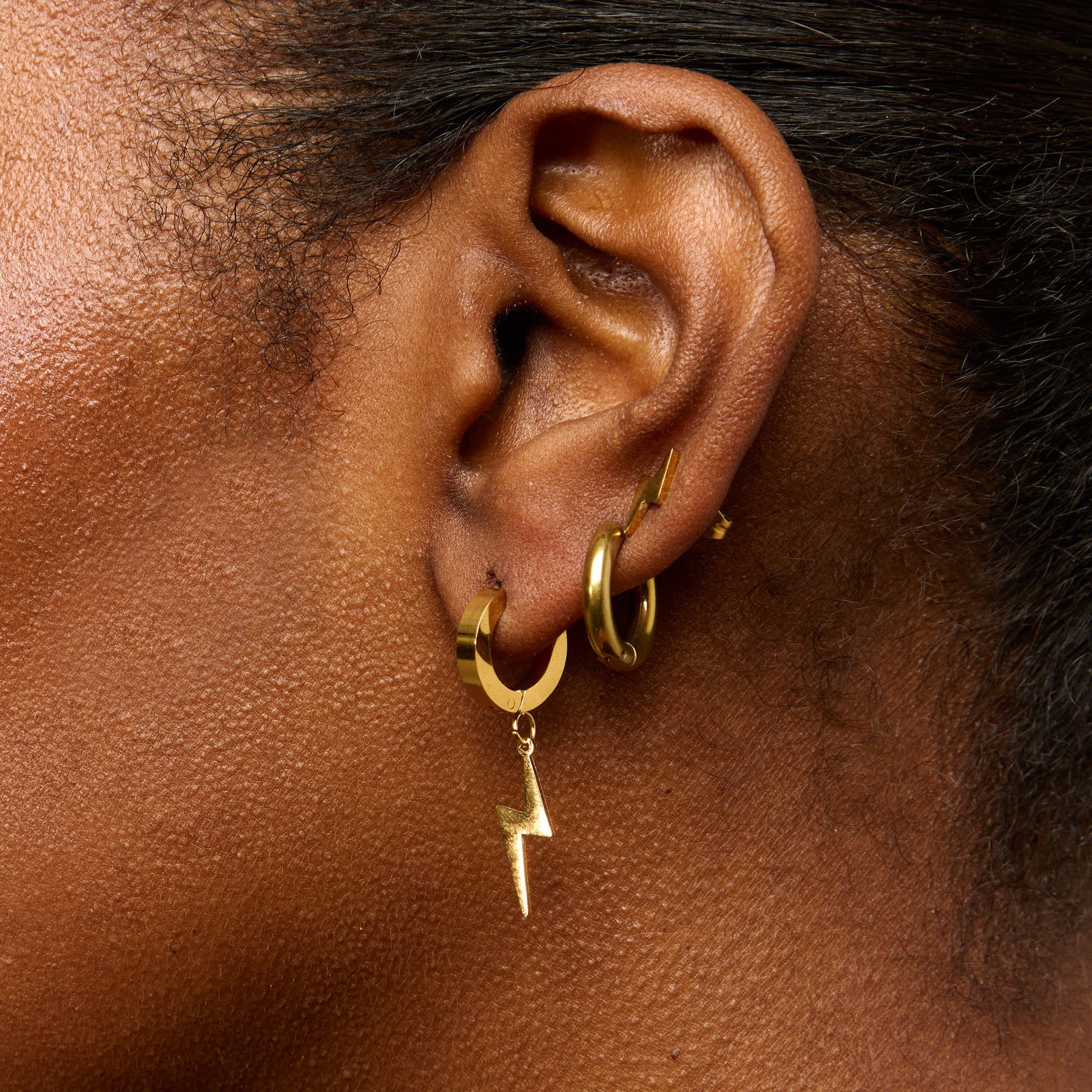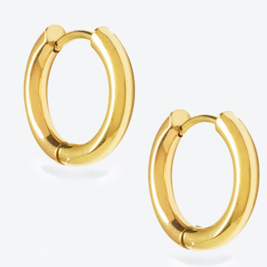These earrings are 18kt gold plated Stainless Steel with a PVD vacuum coating which means it’s 100% waterproof, tarnish free and won’t turn your skin green.