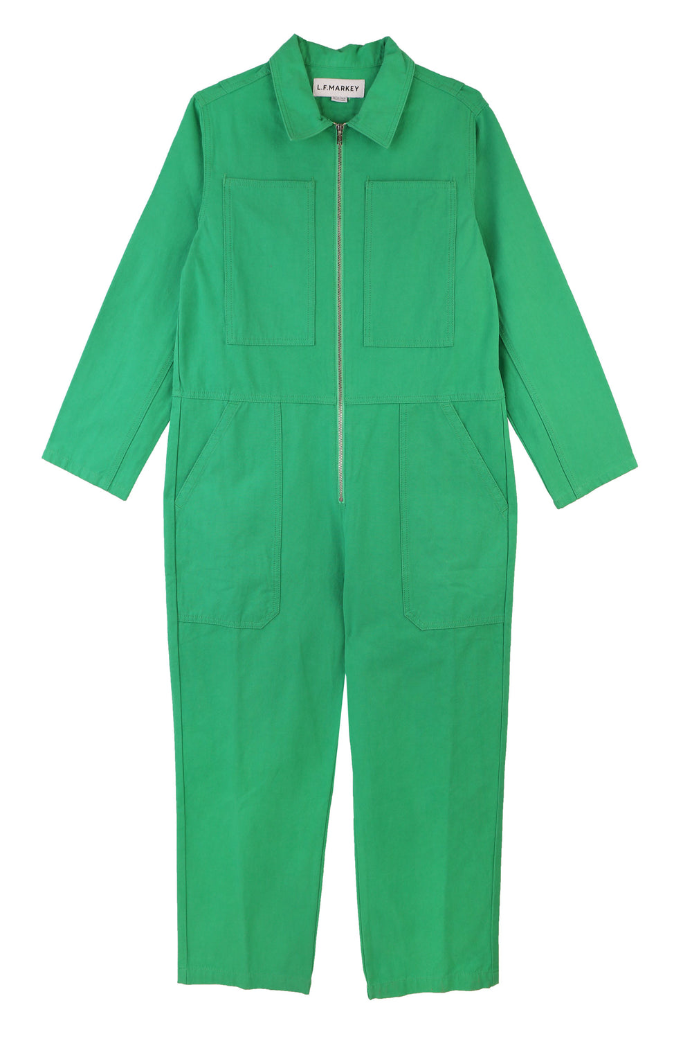 The Dominic Boilersuit has a relaxed fit and a slightly tapered leg, with 3/4 length sleeves. In a vibrant grass green non-stretch cotton canvas, with large utility style pockets and a silver front zip.