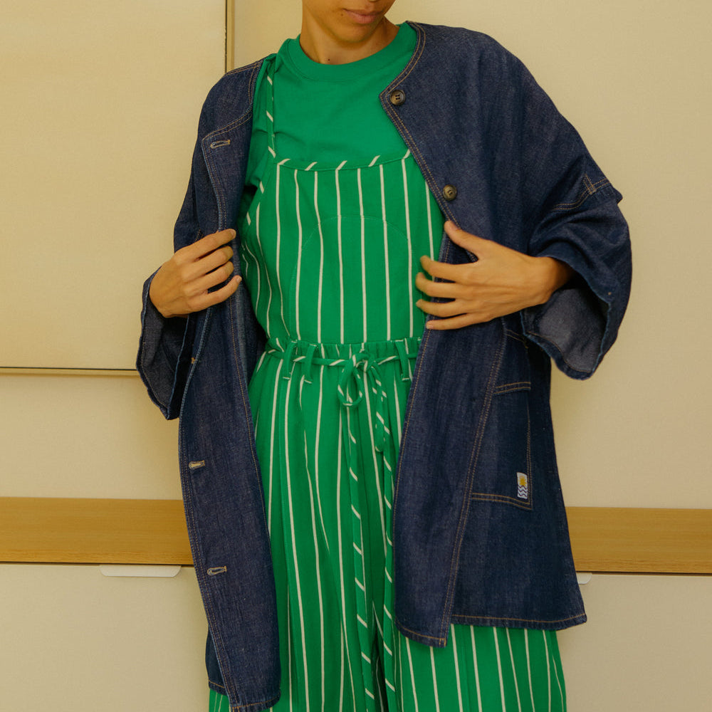 The Lowe Jacket has a wide, slouchy silhouette, with 3/4 length cuffed sleeves and imitation horn buttons. With large front patch pockets, contrast ochre stitching throughout and our signature sun and wave woven patch logo. Made in an Indigo denim chambray woven from a blend of linen and cotton.