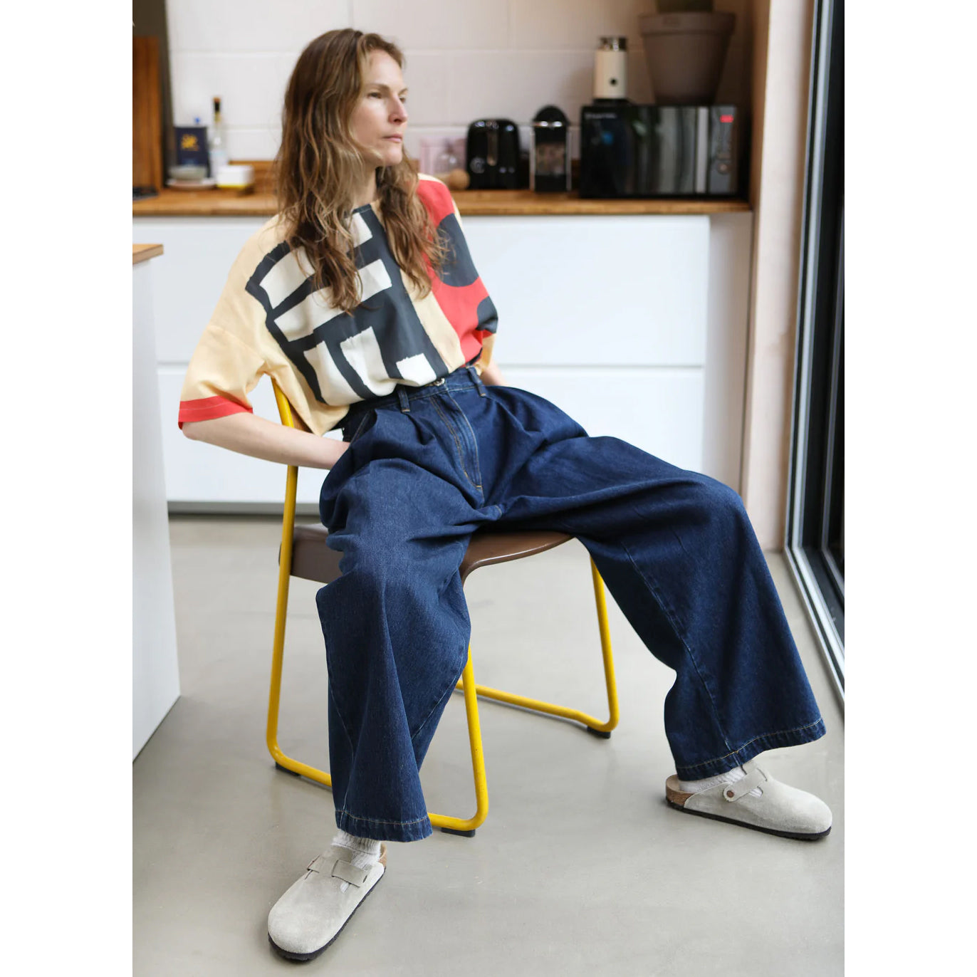 High-waisted pleat front jeans in robust, heavyweight indigo denim. Features utility pocket detailing and contrast ochre topstitching.