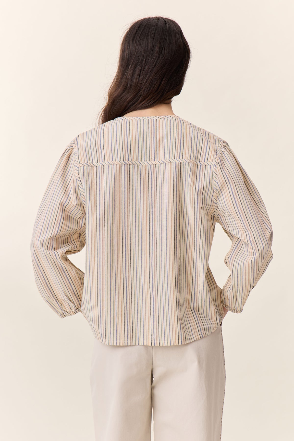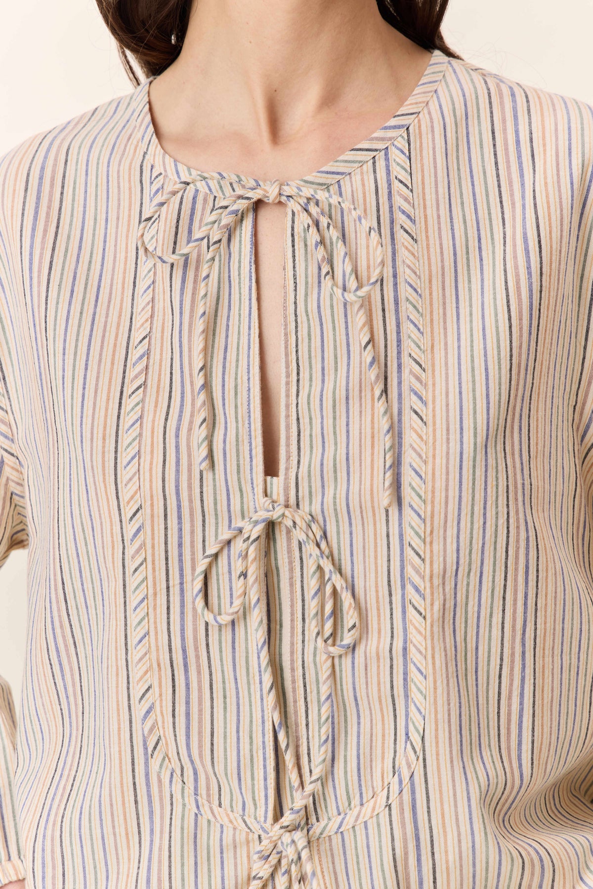 The Carsa Multi blouse entices with its refined details and timeless look. Designed with tie strings on the front and a delicate striped print, it adds a touch of charm and delicacy to the Leon & Harper woman's wardrobe. An elegant blouse combining comfort and femininity.