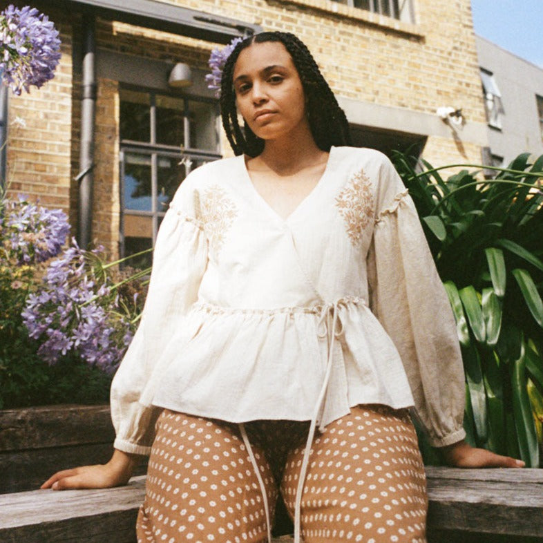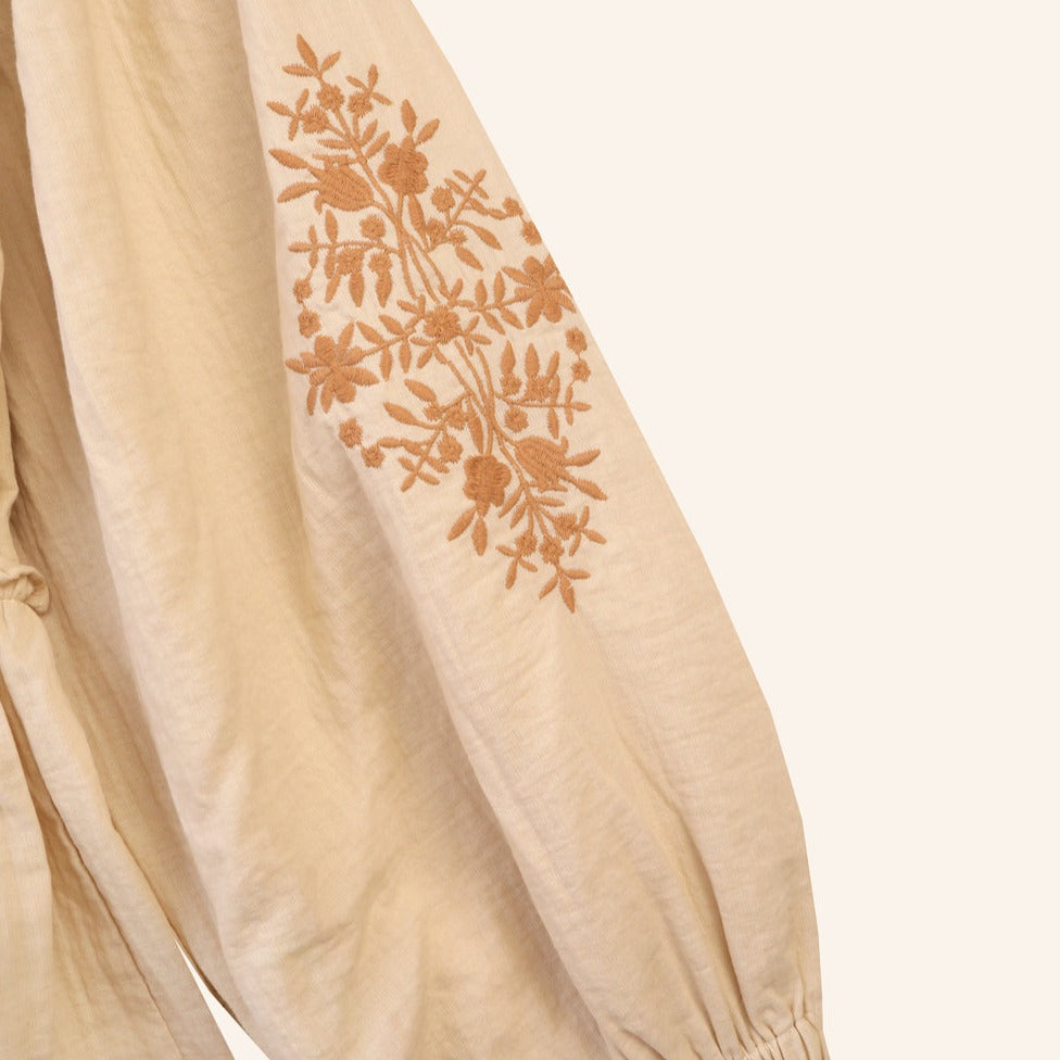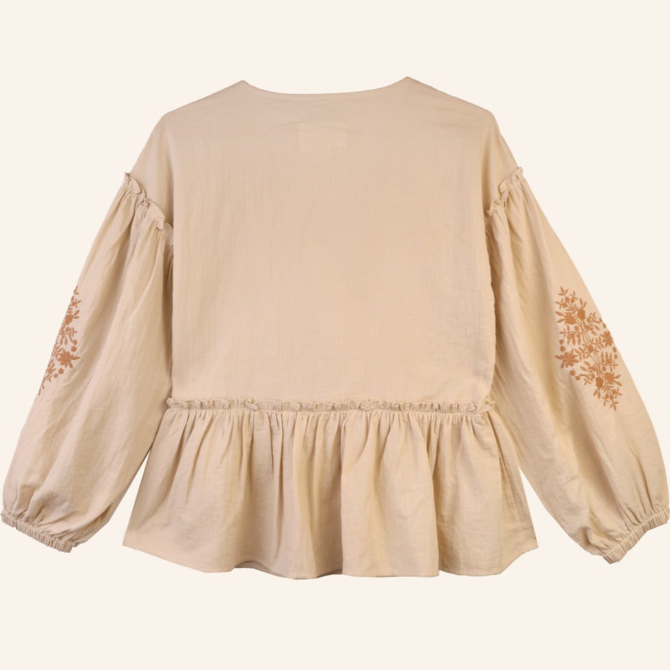 The flay lay images show an accurate representation of the ecru, fawn colour of the blouse with soft brown embroidery detail.
