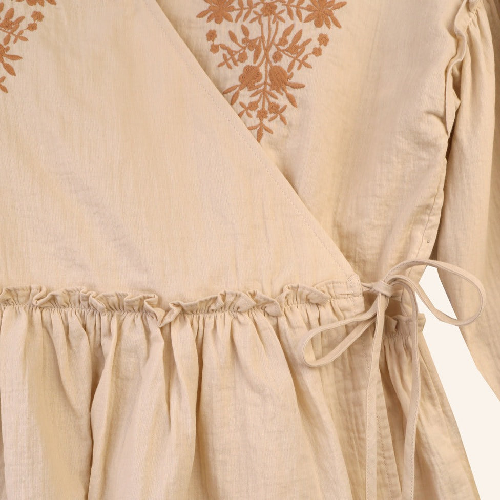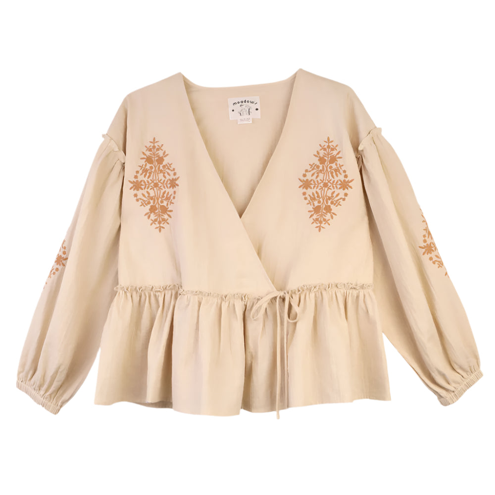 Longsleeve wrap top fastened at the waist with ties, a low v-neckline and long sleeves. The relaxed voluminous shape is enhanced by a gathered waist, cuff and shoulder. With embroidered detailing on the chest and sleeve.