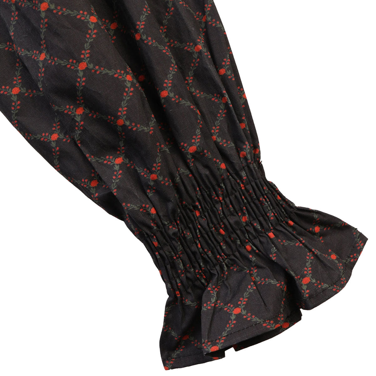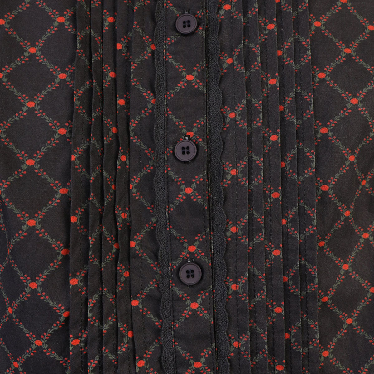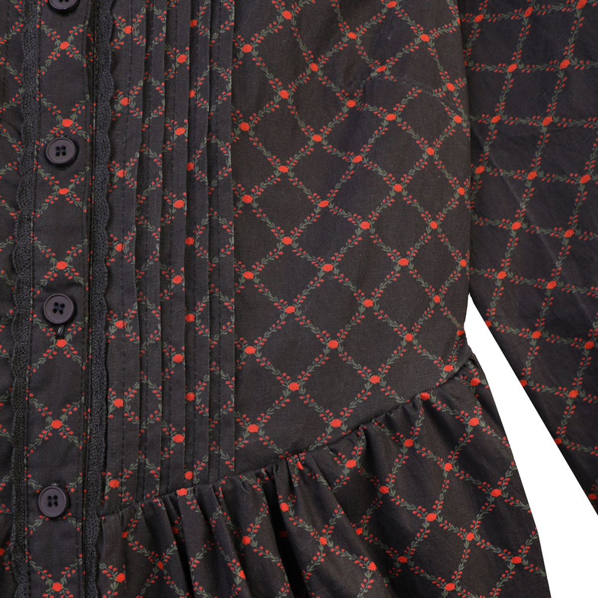 The Sierra Dress is a long sleeve cotton poplin dress with a grandad collar, decorative central panel pleating, a tortoise shell button opening, and shirred cuffs. Features a gathered waist and mid-length tiered skirt for added volume. The Cross Floral Print features miniature floral lattices set on deep navy.