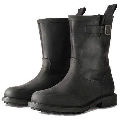LEATHER PULL ON BOOT. BOUND TOP EDGE AND BUCKLE ADJUST DETAIL AT CALF. PULL ON LOOP.