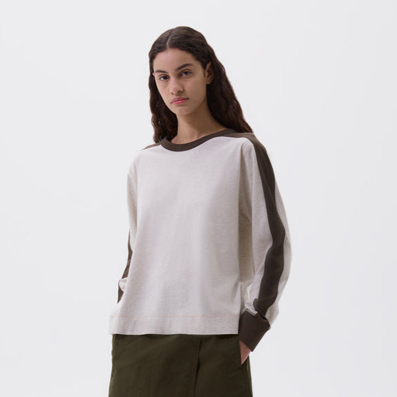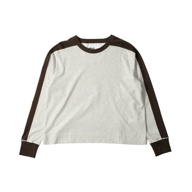 The MHL. Training Top has a regular cut and is fabricated in cotton melange jersey with a supersoft hand feel. Featuring a contrasting rib on the arms and cuffs, the top is finished with flatlock stitch seam detailing and half moon stitch detailing on the back yoke.