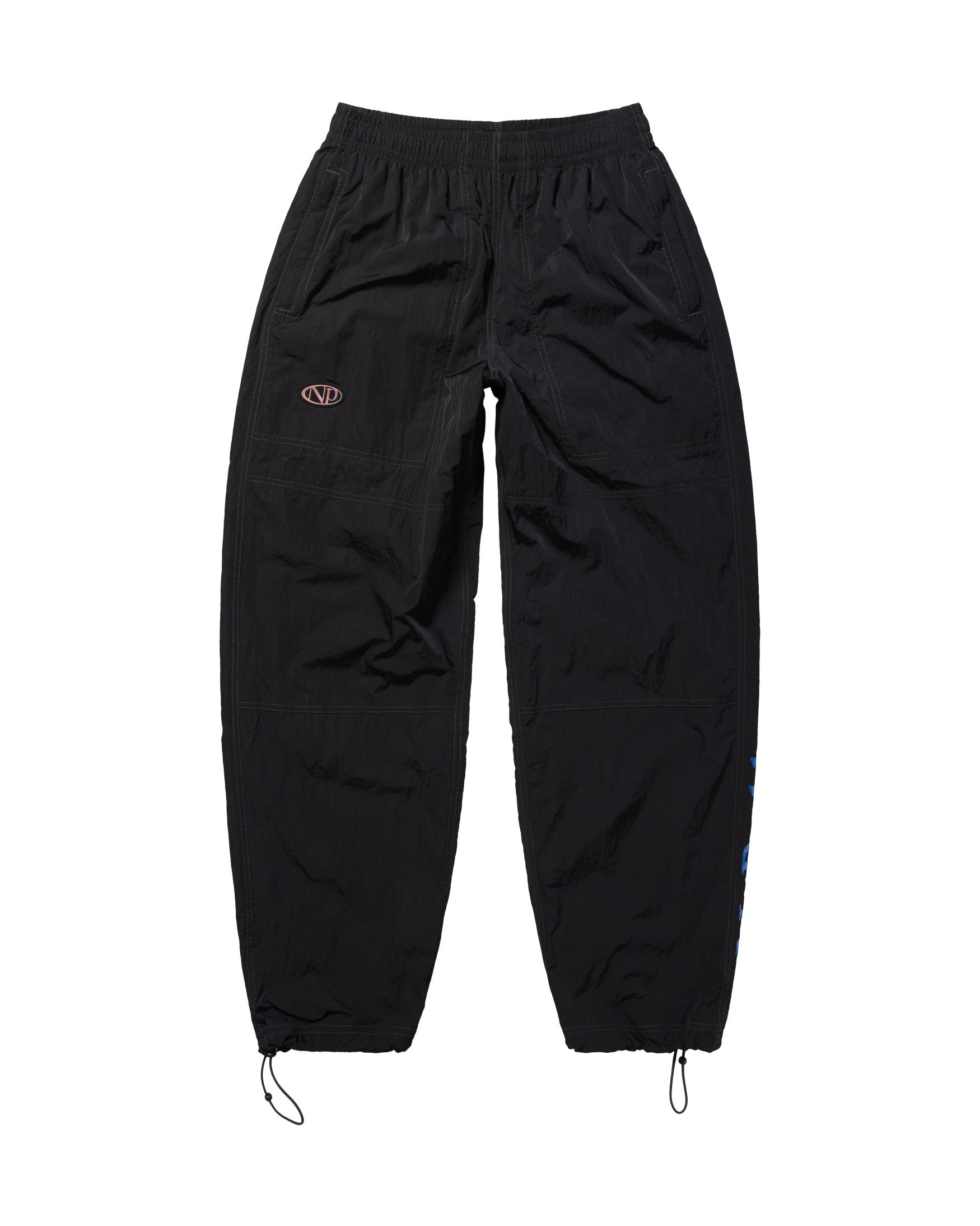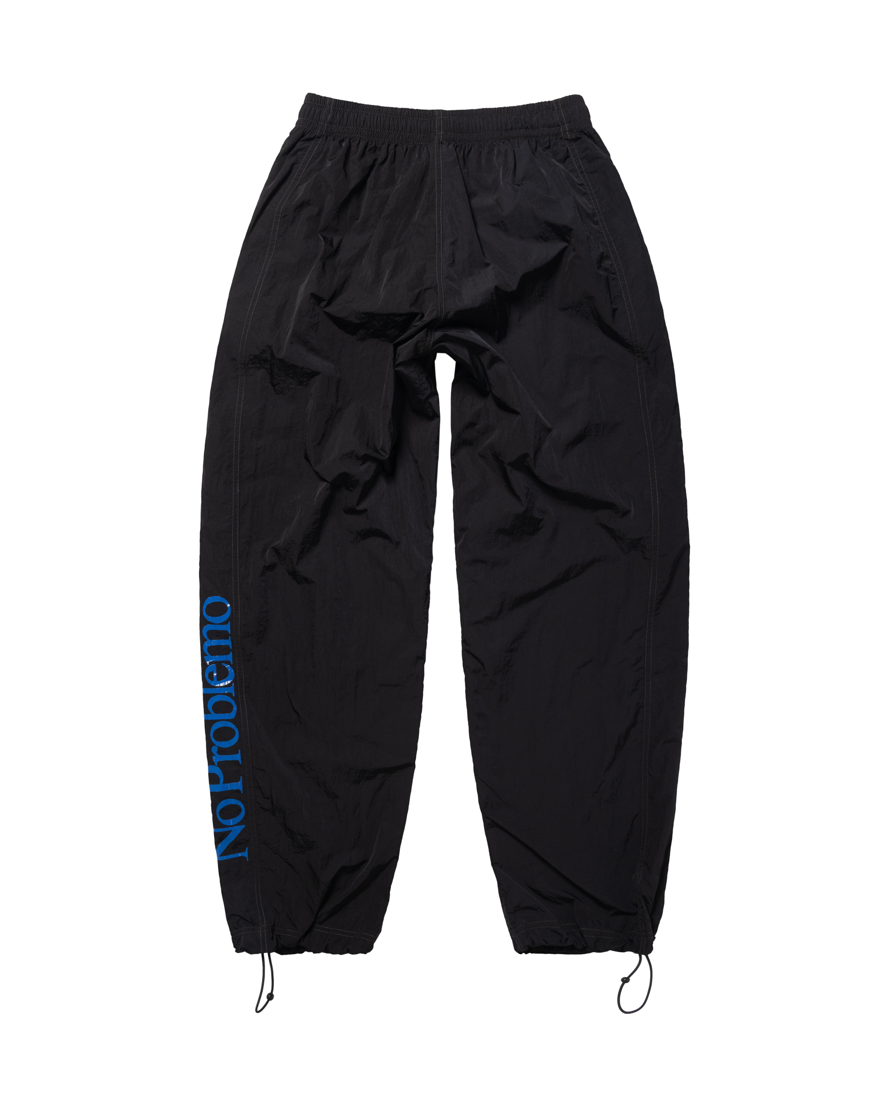 - Unisex lightweight nylon track-pant with an elasticated waistband, ankle toggles, reinforced knees and side zipped pockets. With a holographic silicone brand patch, and No Problemo screen print down the side leg.