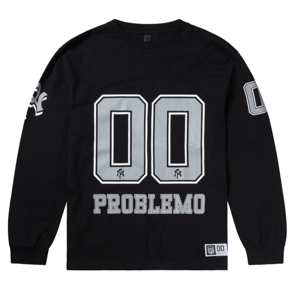 cotton sport jersey long sleeve t-shirt with 'zero problemo' graphic print on the front and sleeve, featuring branded label on the front.