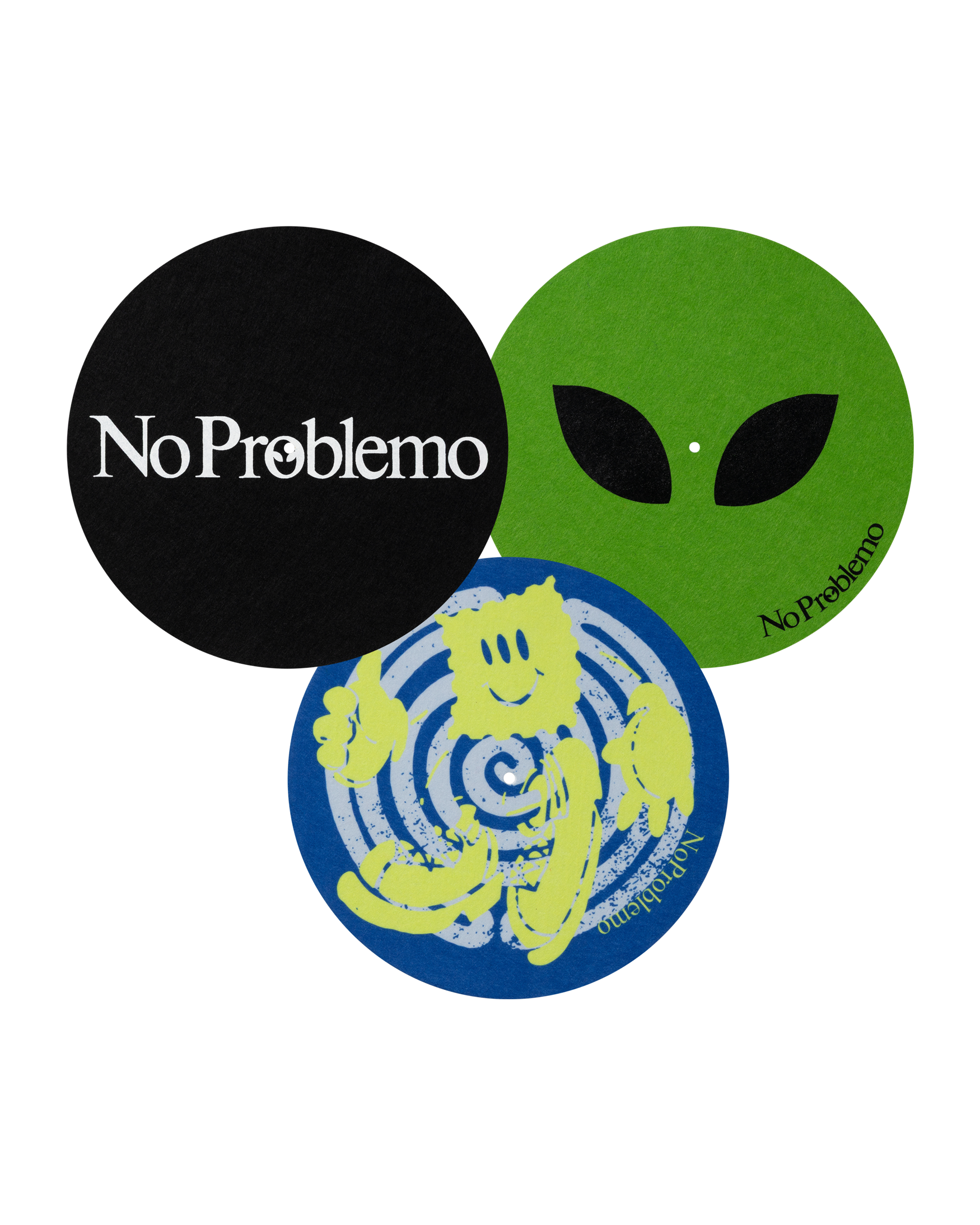 - POLYESTER TURNTABLE SLIPMATS FEATURING CLASSIC NO PROBLEMO, ALIEN-O EYES AND ACID TEAM GRAPHICS