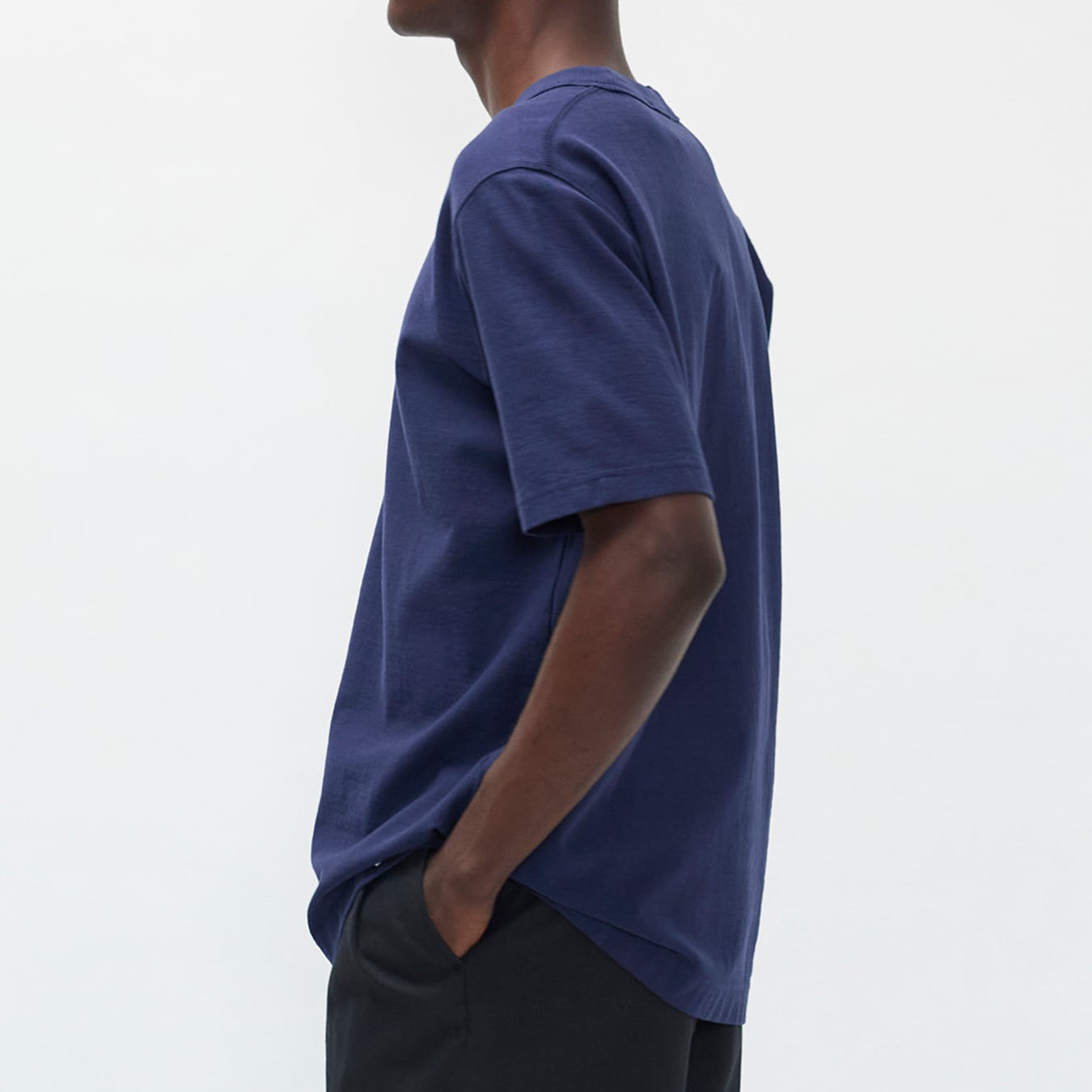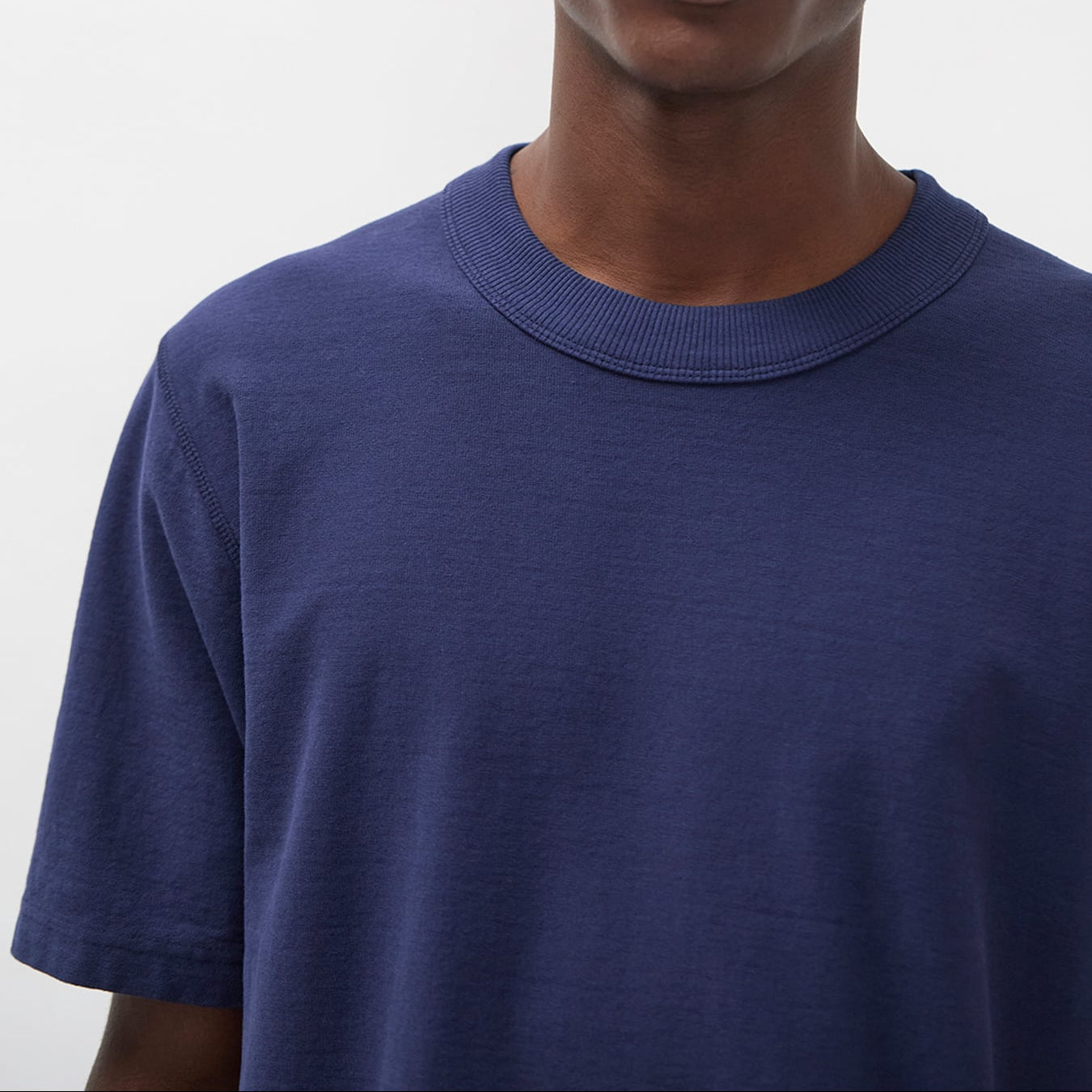 A relaxed fitting garment dyed t-shirt cut from an organic midweight dry cotton jersey. It features ribbed binding at the neck, twin needle stitched hem and cuffs and finished with a branded tab at the front.