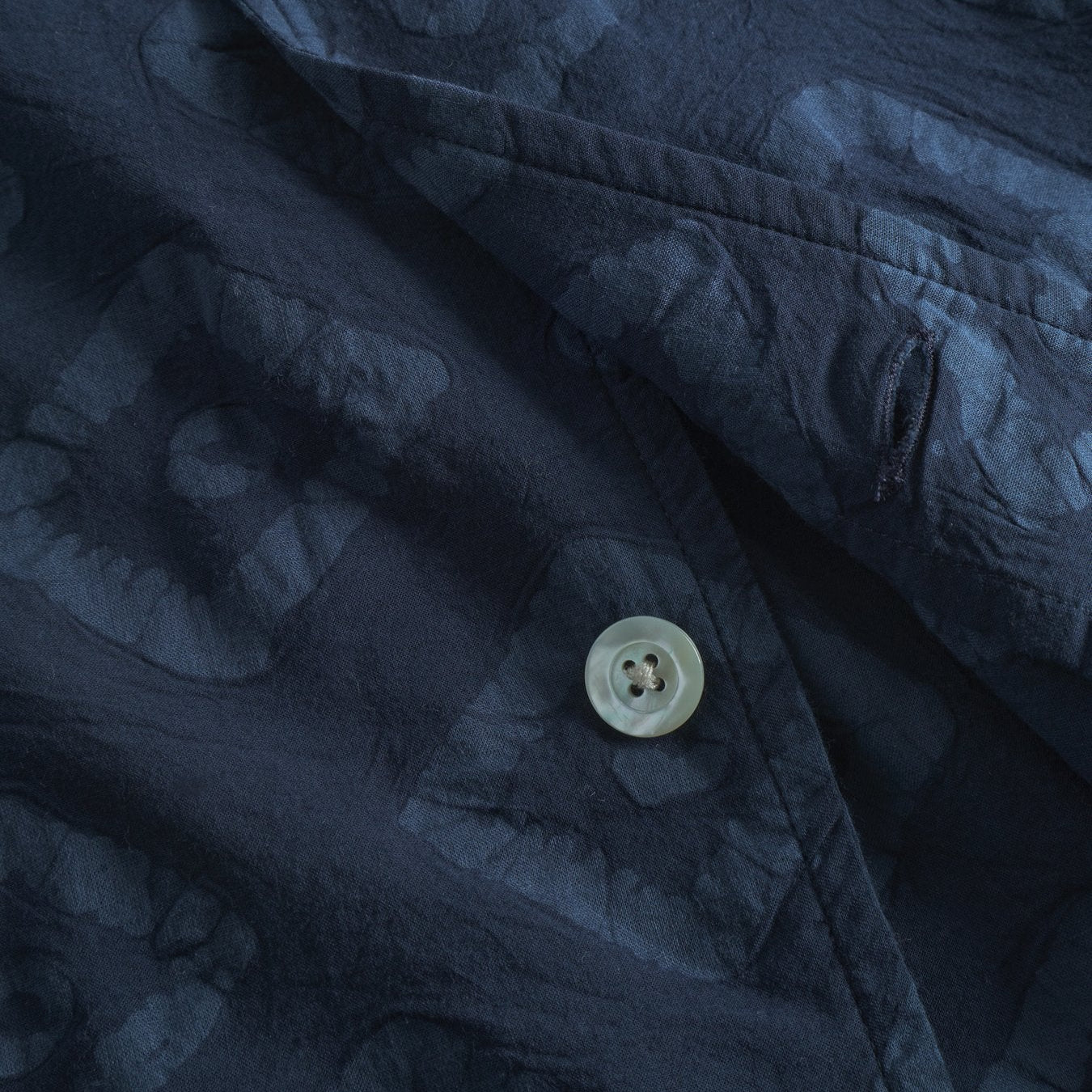 A short sleeve shirt, with an open collar and relaxed oversized fit, constructed from light-weight cotton lawn, which is washed for a casual and soft handfeel. This shirt features a batik print, which is a wax-resist dyeing technique. Finished with Mother of Pearl buttons.