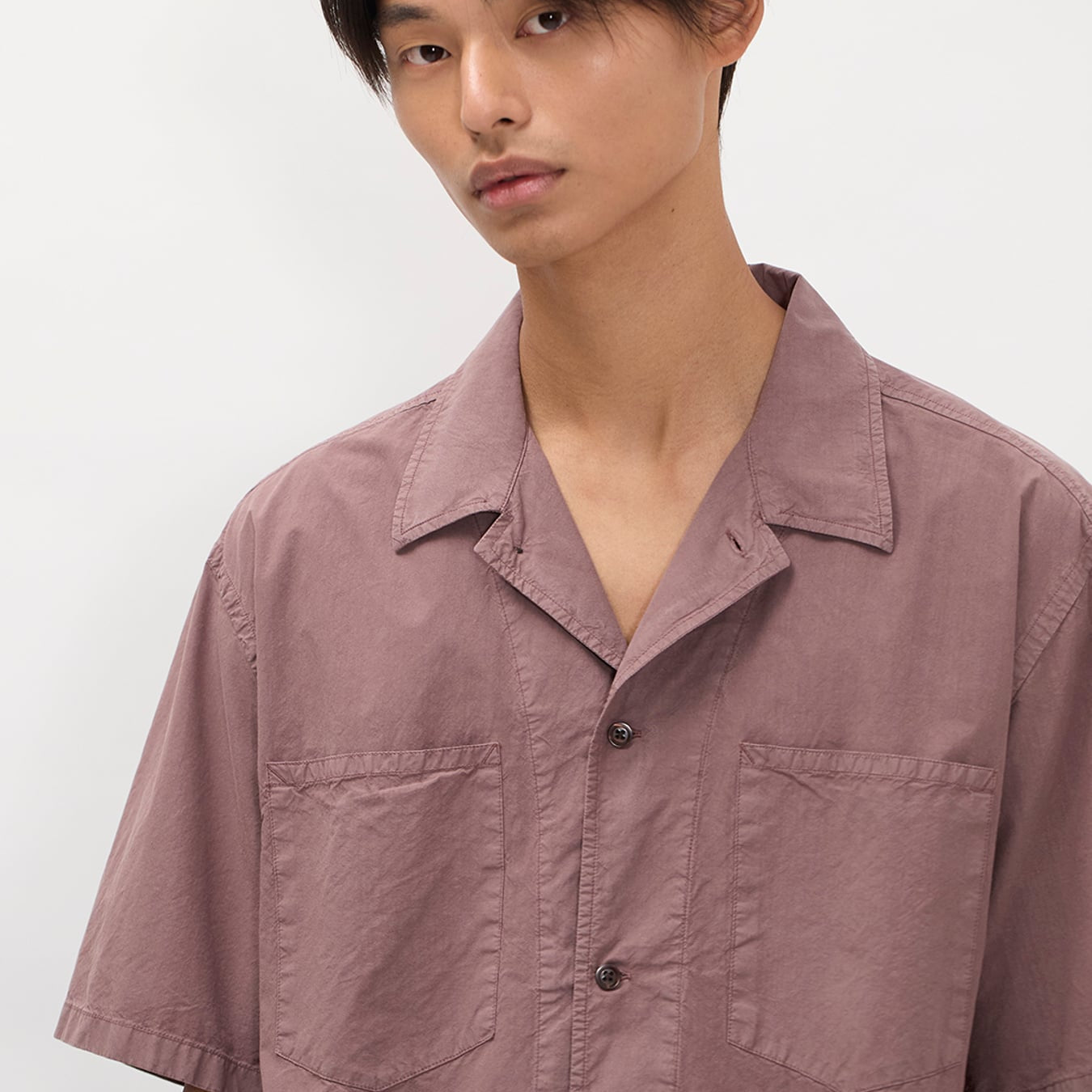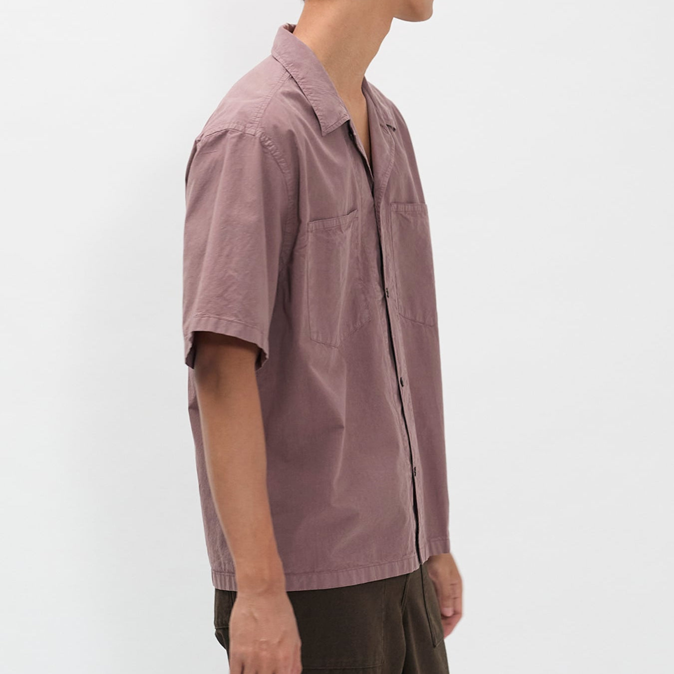 A short sleeve shirt, with an open camp collar and relaxed oversized fit cut from a crisp Tencel® blend poplin. This shirt is garment dyed in a way that achieves a distinct softened hue, and an effortless look. Features front chest pockets, box pleat at the back, straight hem and mother of pearl buttons.