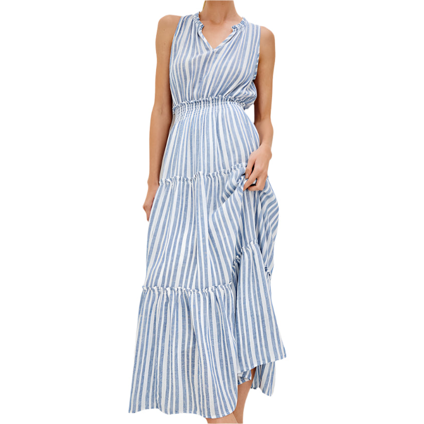 The Lou Lou is a luxe linen-blend dress with waist-cinching smocking. This maxi has a v-neckline and fully-lined skirt with ruffle detail at each tier.
