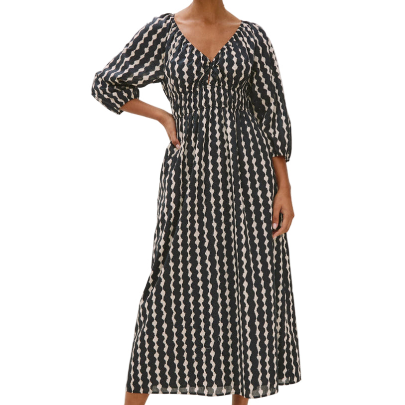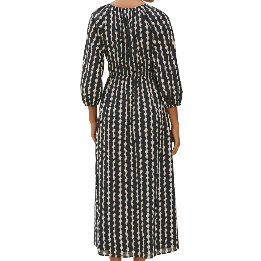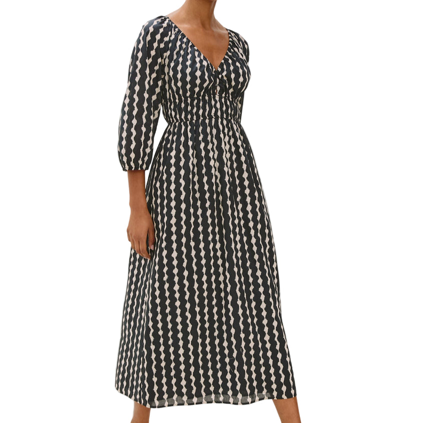 The Paio dress flatters with a fitted bodice and full-length, flowy skirt. Lightly elasticated bracelet-length sleeves and a hook-and-eye front closure offer flexibility, while full lining ensures all-day comfort.