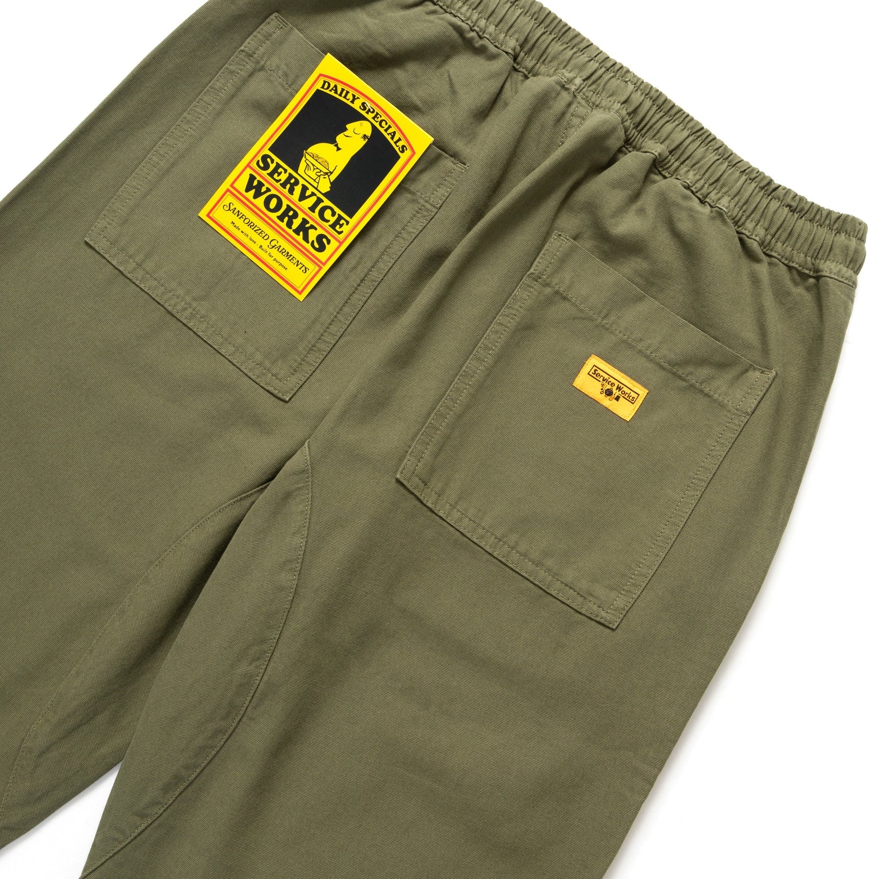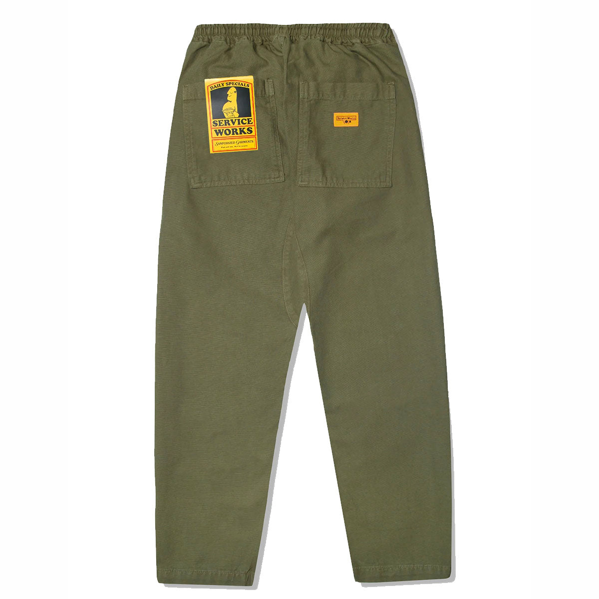Classic Chef Trousers by Service Works, Classic straight fit leg, Organic GOTS 360gsm (11oz) cotton canvas, Adjustable waistband with drawstring, Fatigue front pockets, Rear pockets with woven label.
