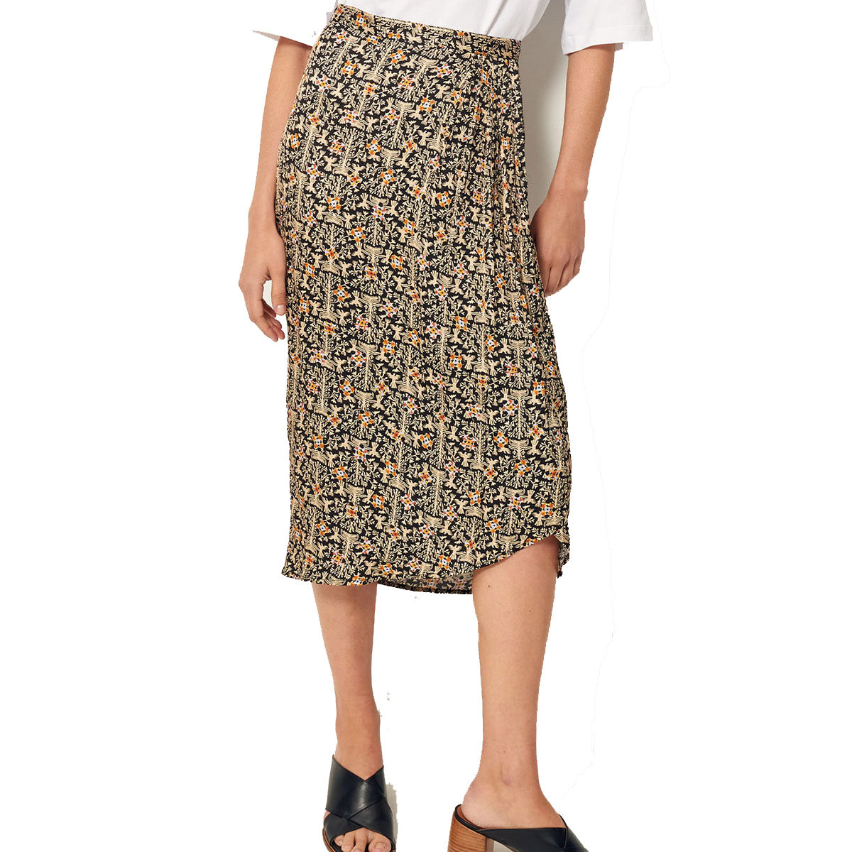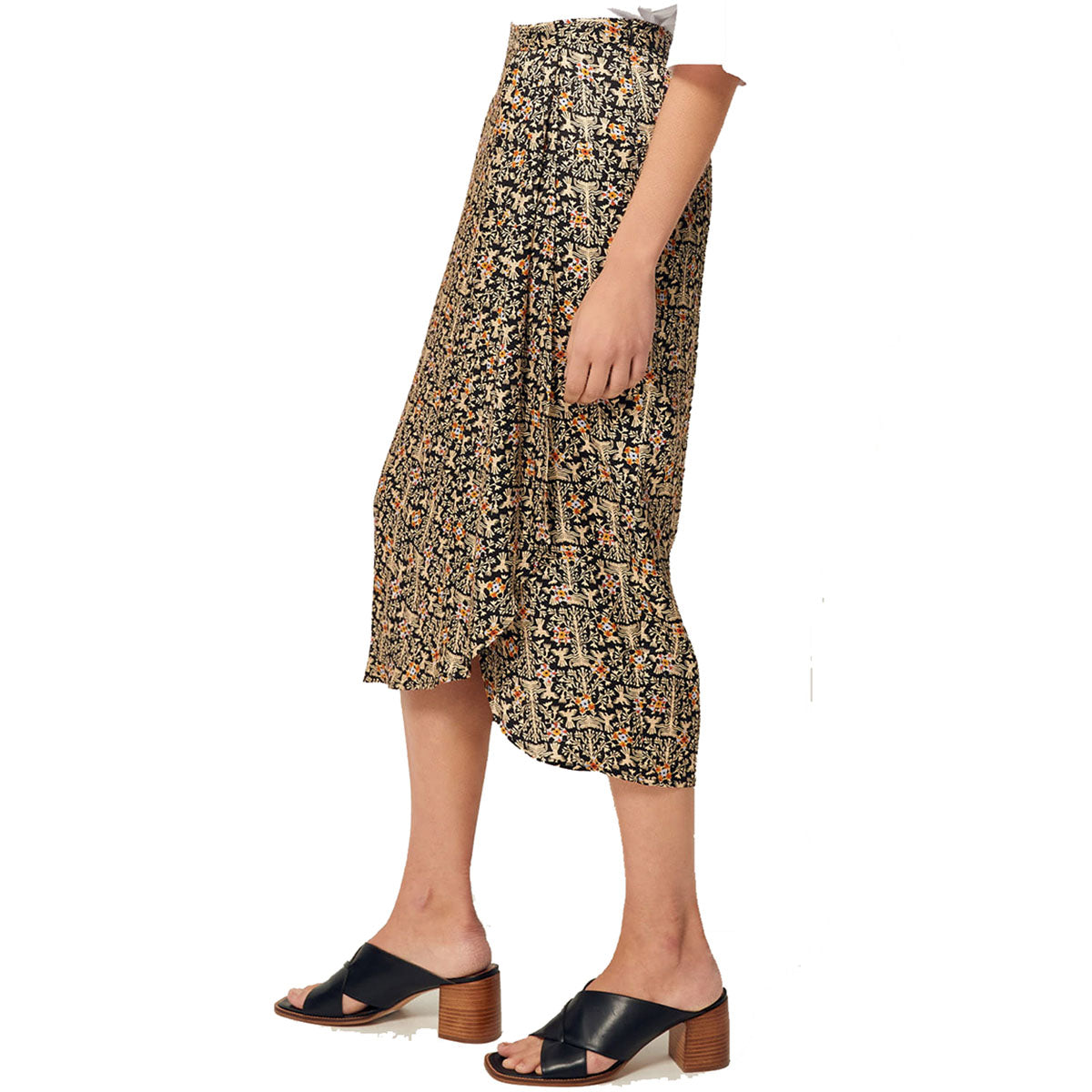 Wrap skirt with flat pleats at the waist, midi-length, in a fluid satin print, printed and finished in Italy, exclusive Sessùn pattern.