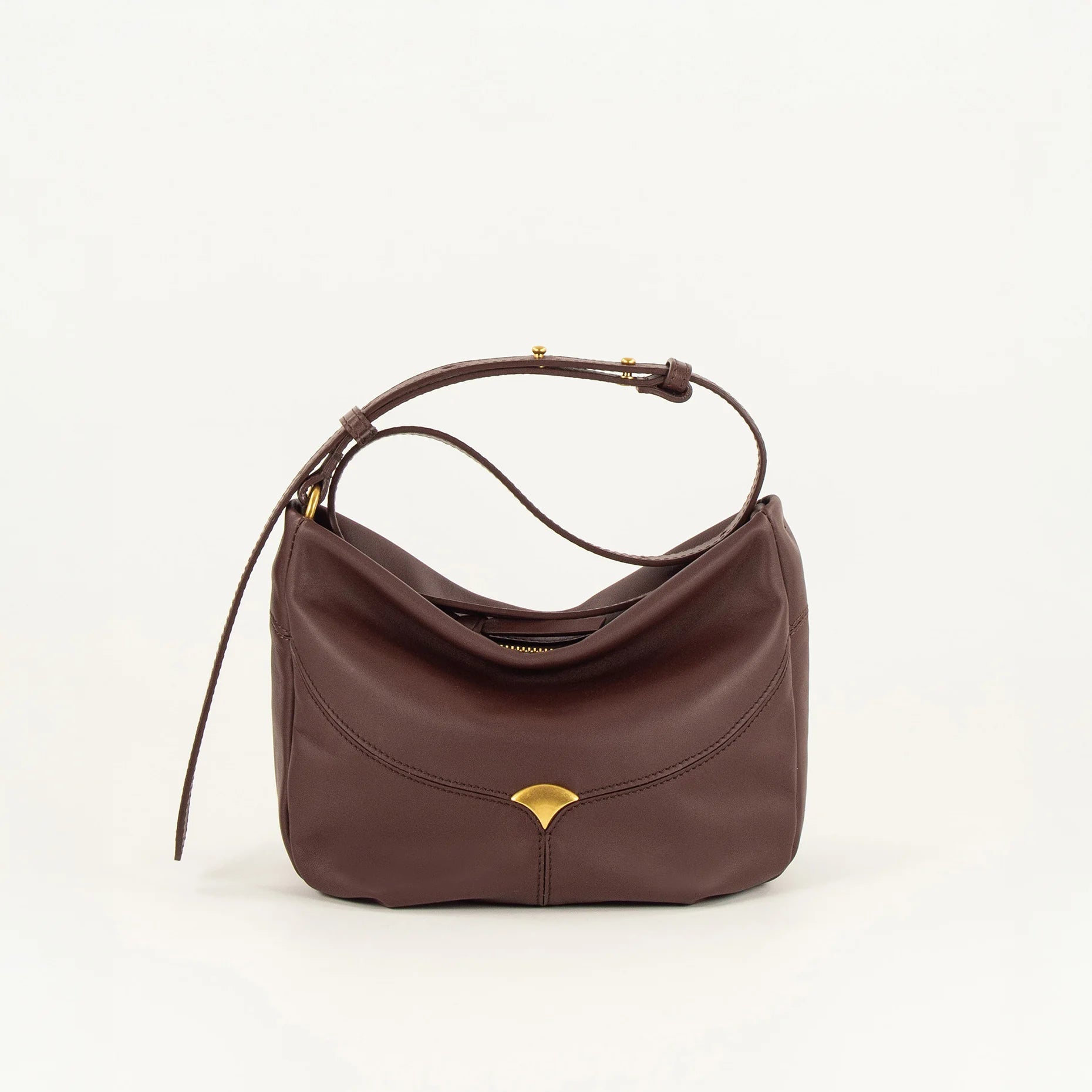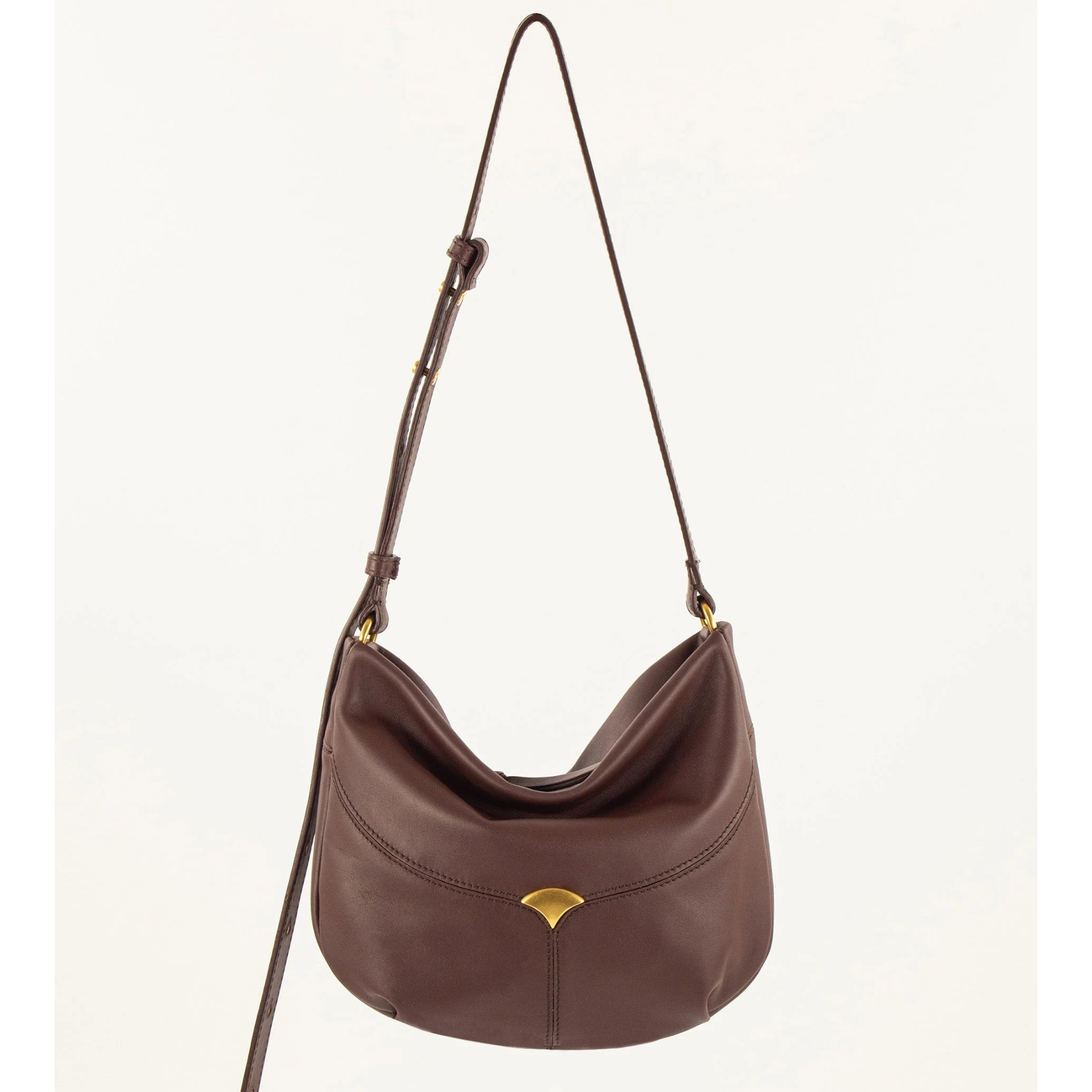 Small, soft hobo bag in cowhide leather with topstitching details. Decorative metal piece, exclusively designed by Sessùn.
