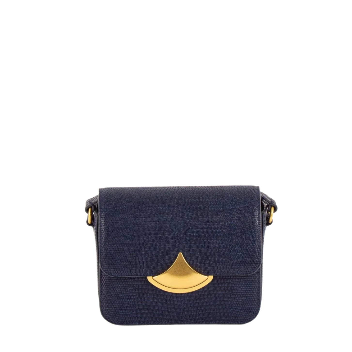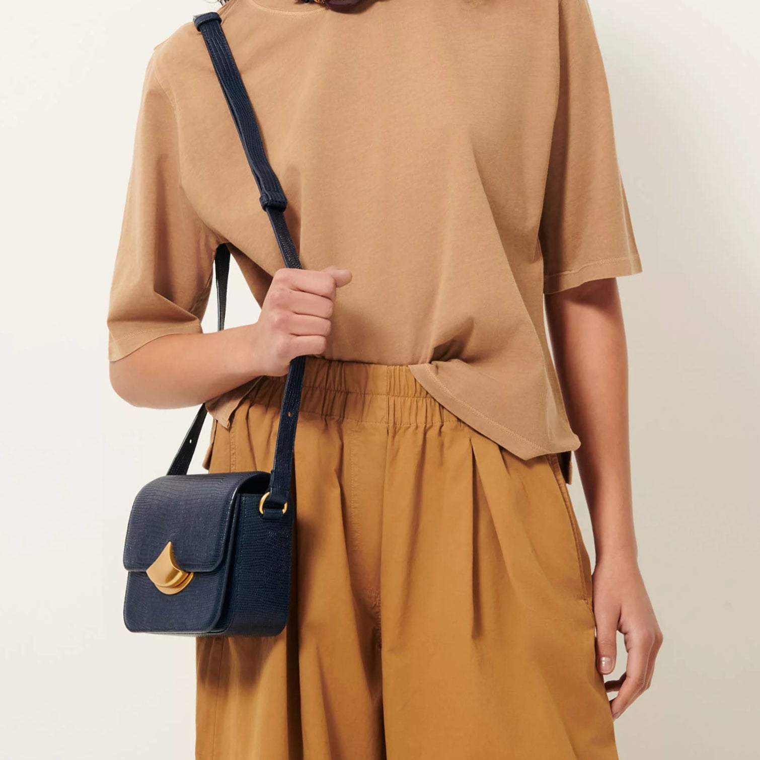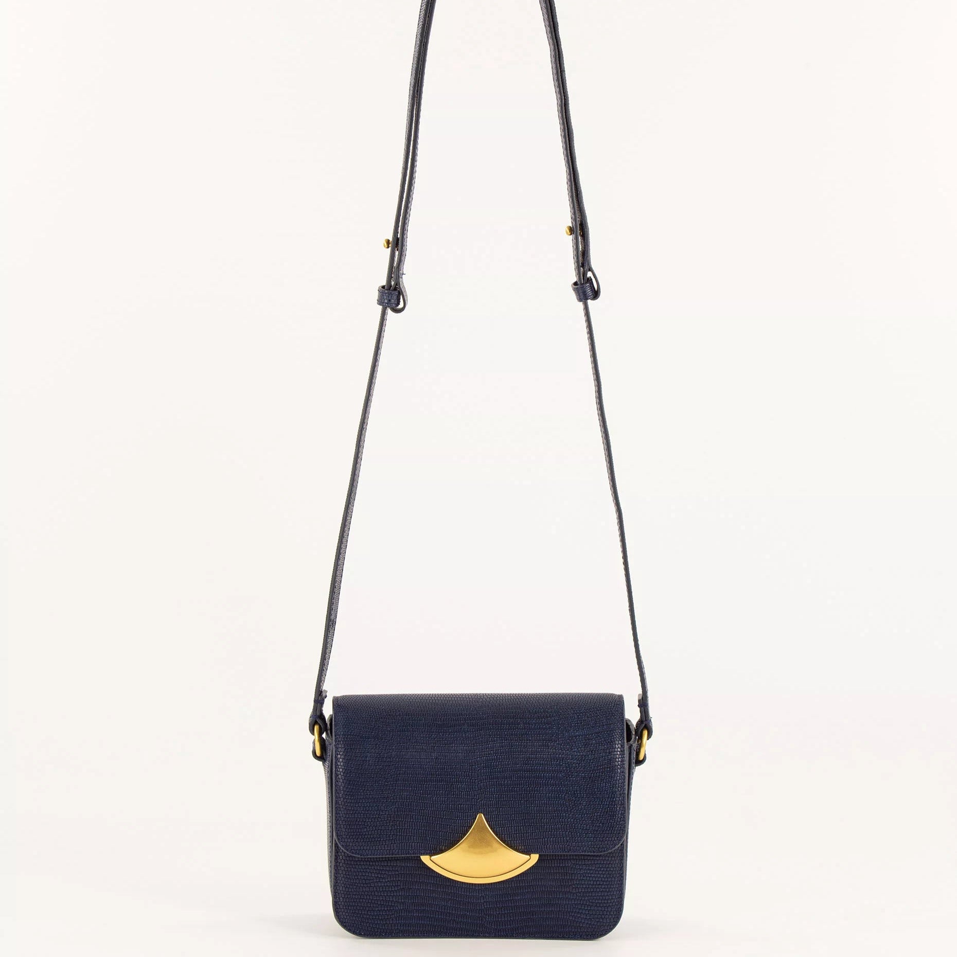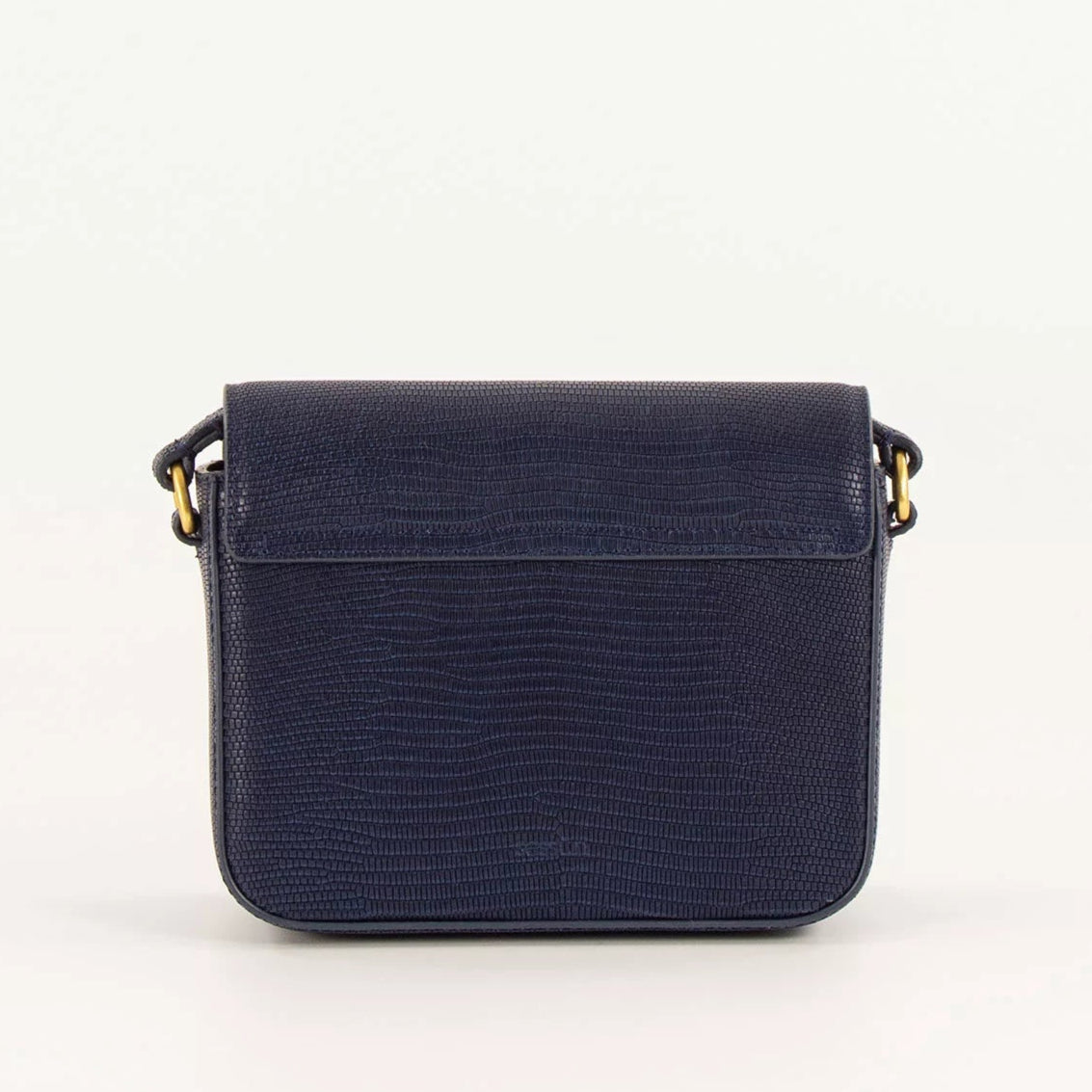 Small box bag in lizard print cowhide, featuring two compartments and a magnetic clasp. Developed exclusively by Sessùn.