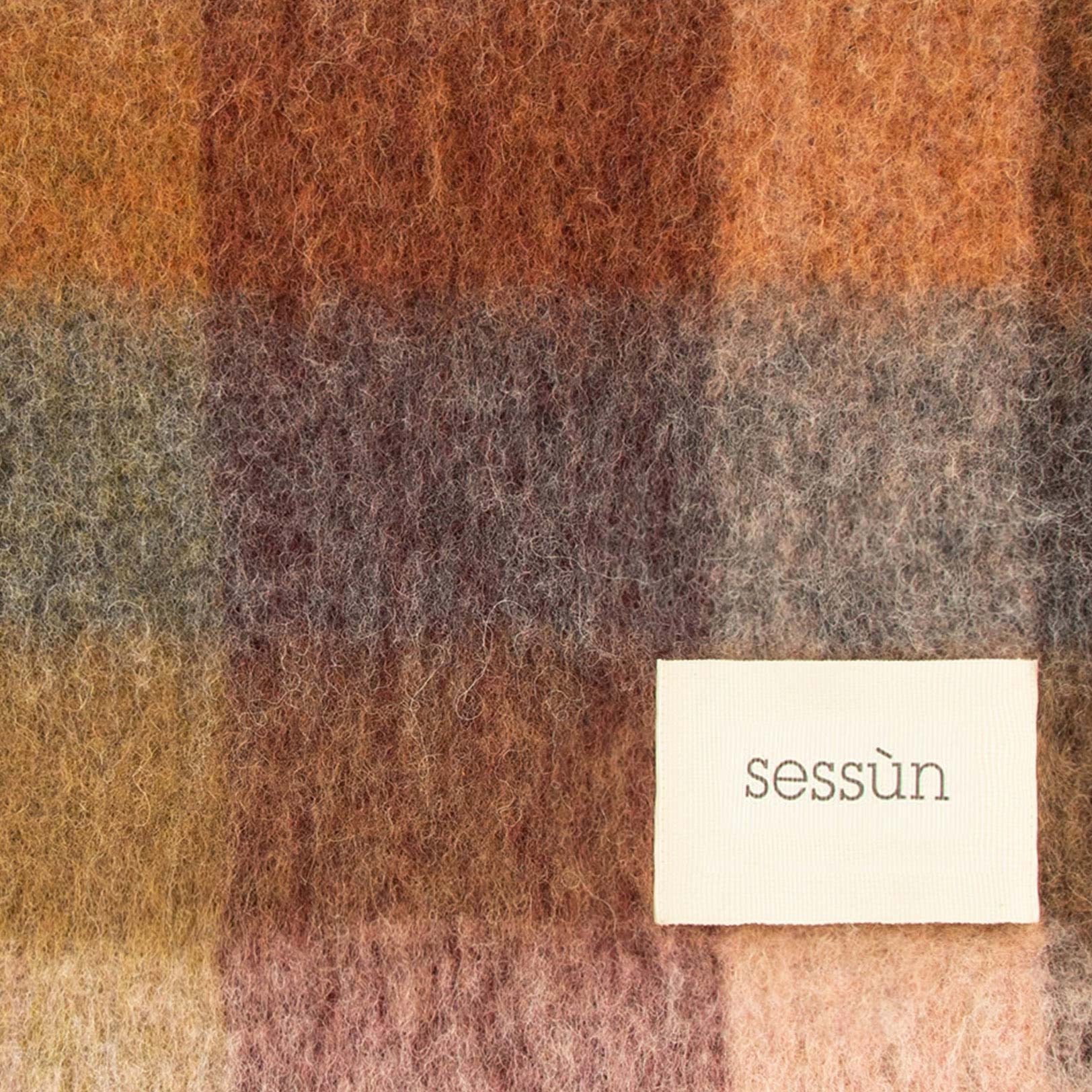 Check pattern scarf with fringed edges. Embroidered label with Sessùn logo.