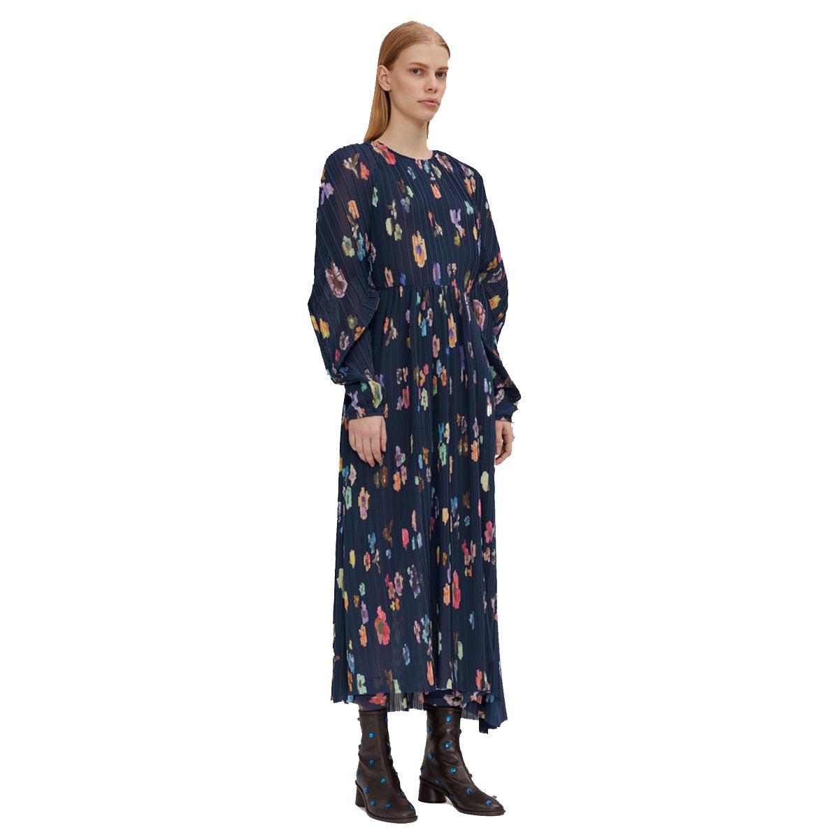 Luella Dress in Flowers Live at Night print. Mid length loose fitting dress with long voluminous sleeves. Detailed pleated fabric. Fully lined. Made of 100% Recycled Polyester. Pair with Allison Boots in Burgundy.