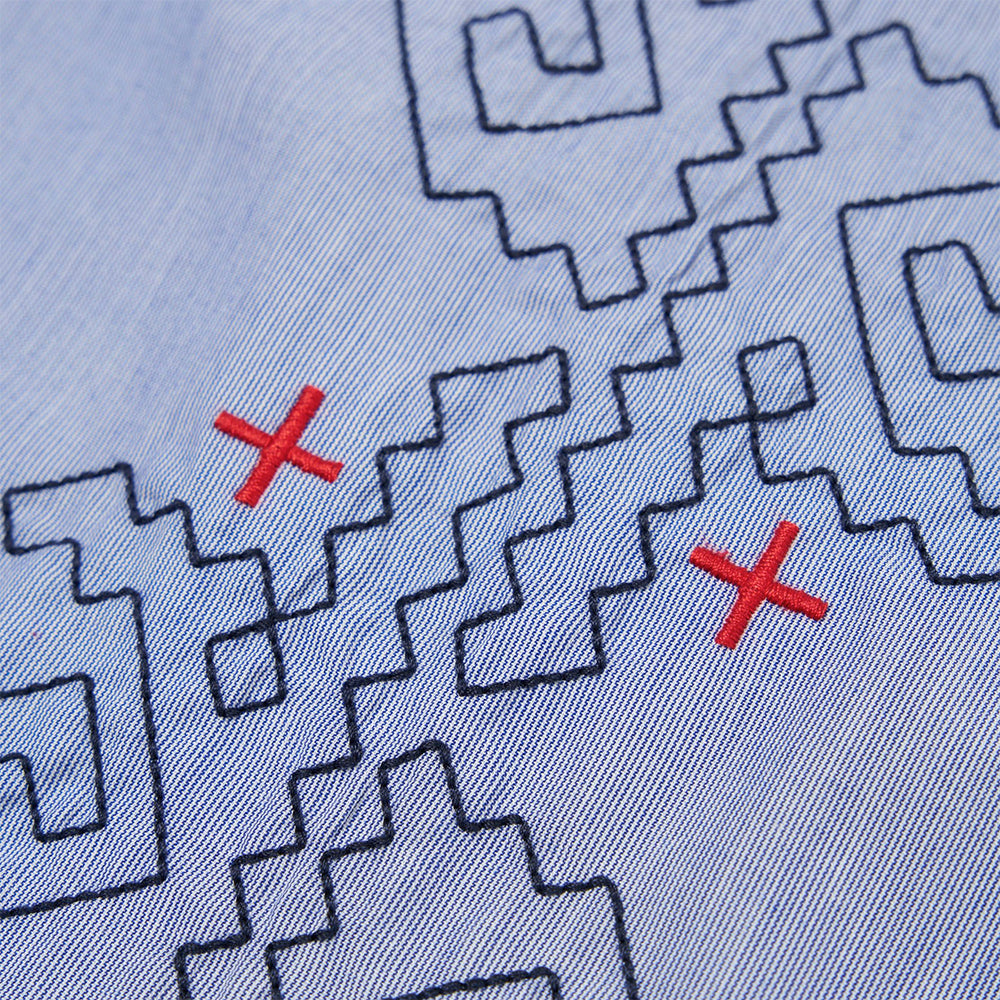 Blue and red embroidered patterned stitch detailing down front of shirt