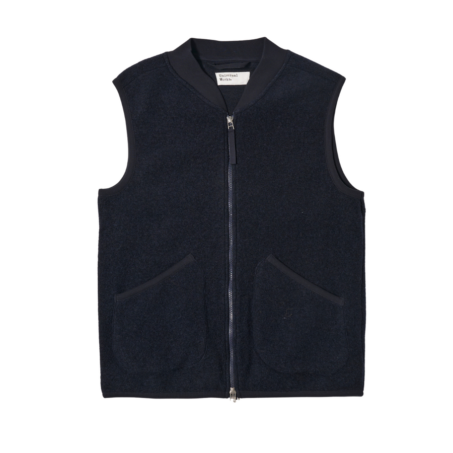 Universal Works Wool Fleece Zip Waistcoat Navy