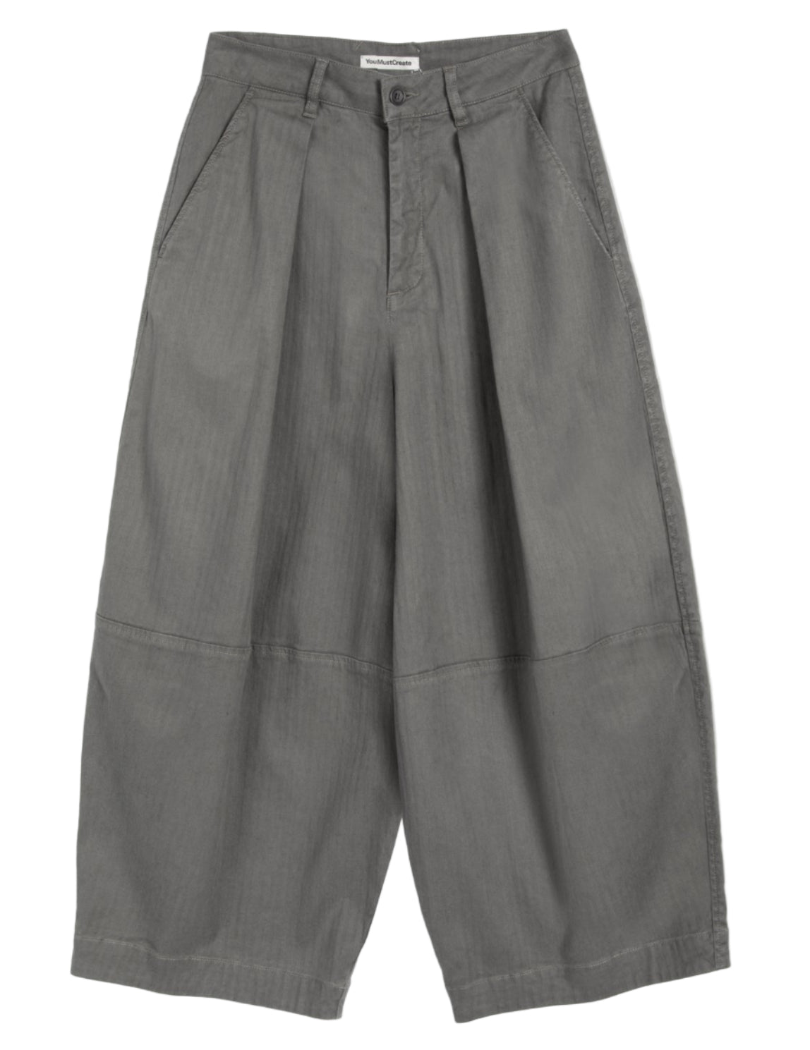 YMC classic Deadbeat trouser, a wide leg high-waisted trousers in a French herringbone twill this season.