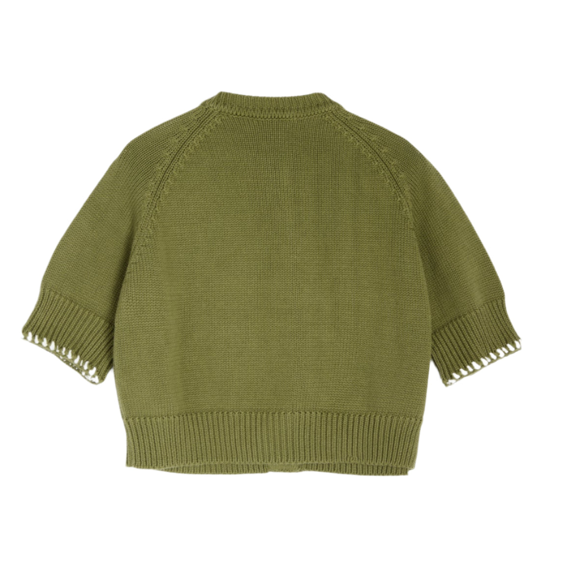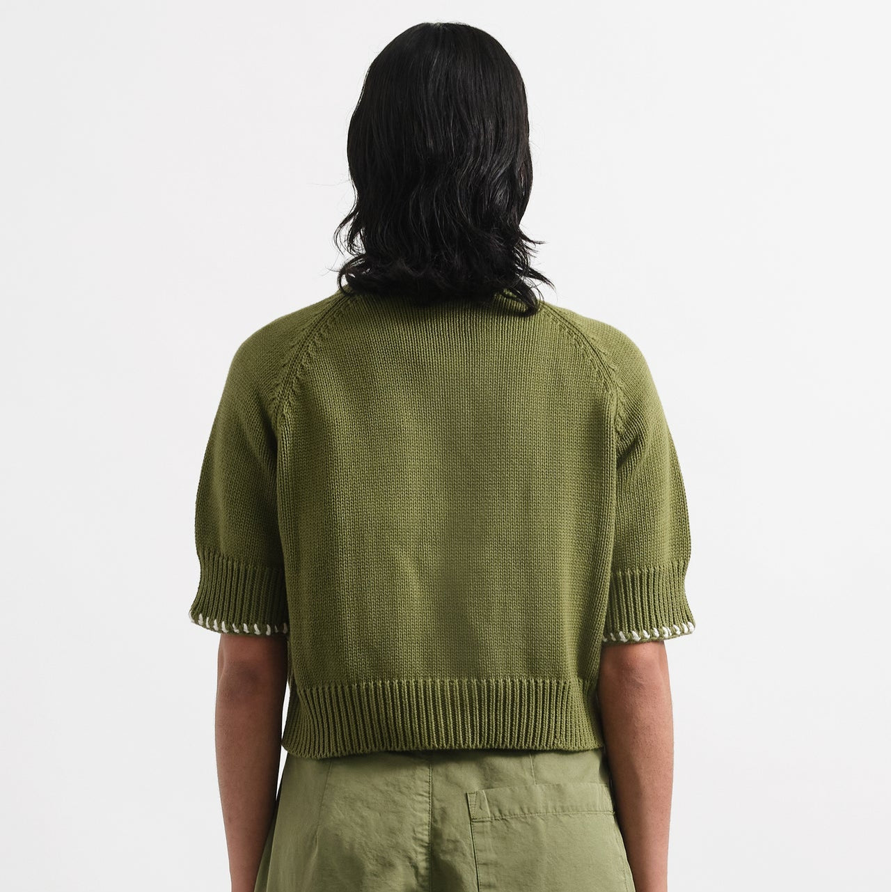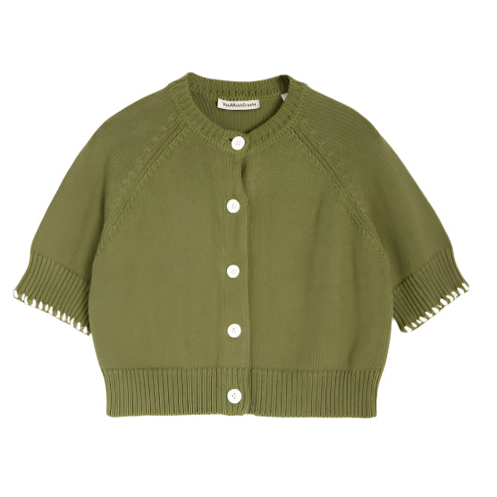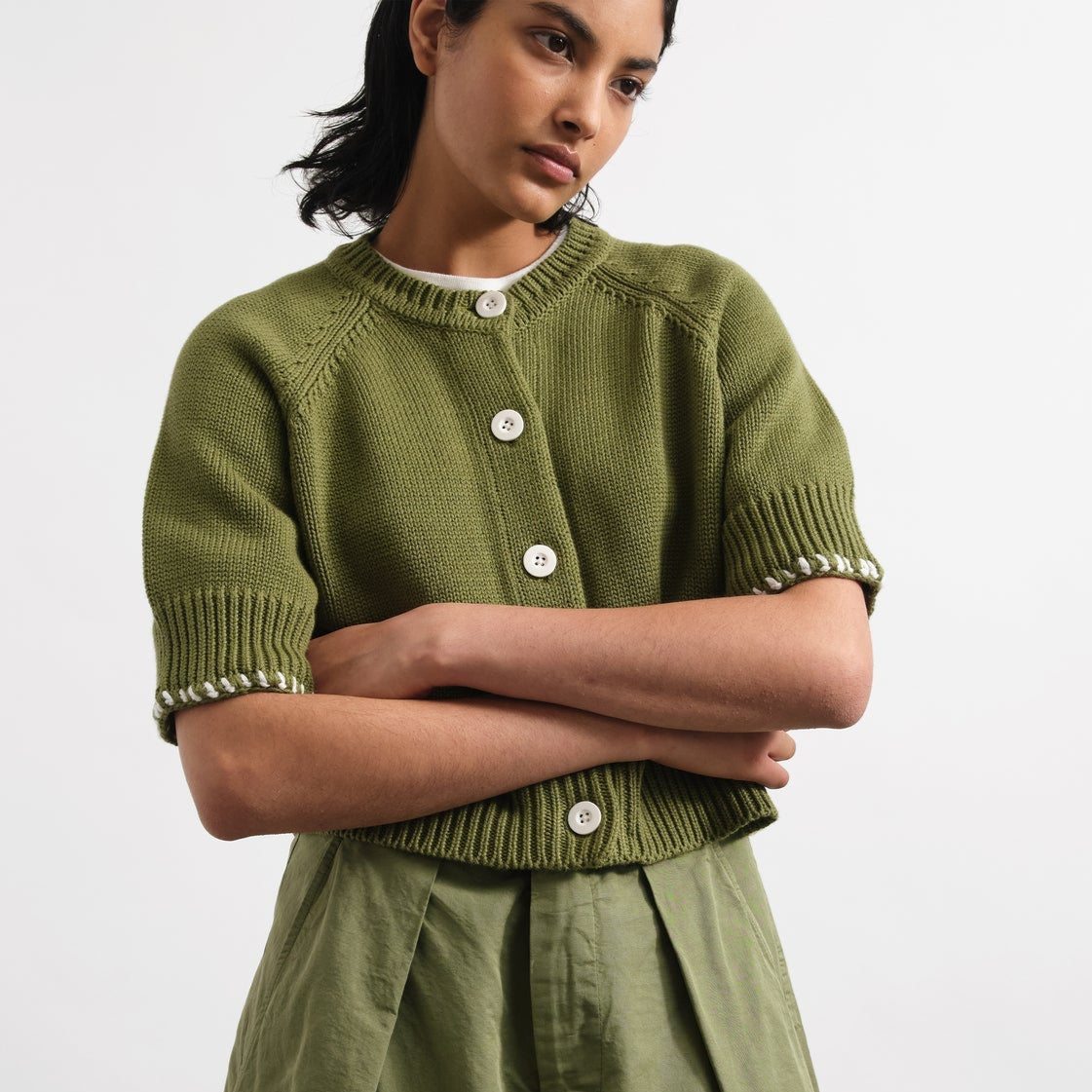 Cropped short sleeve cardiganCotton yarnHand crochet stitch detailingRib knit neck, cuffs and hemCorozo button fasteningRegular, cropped fit