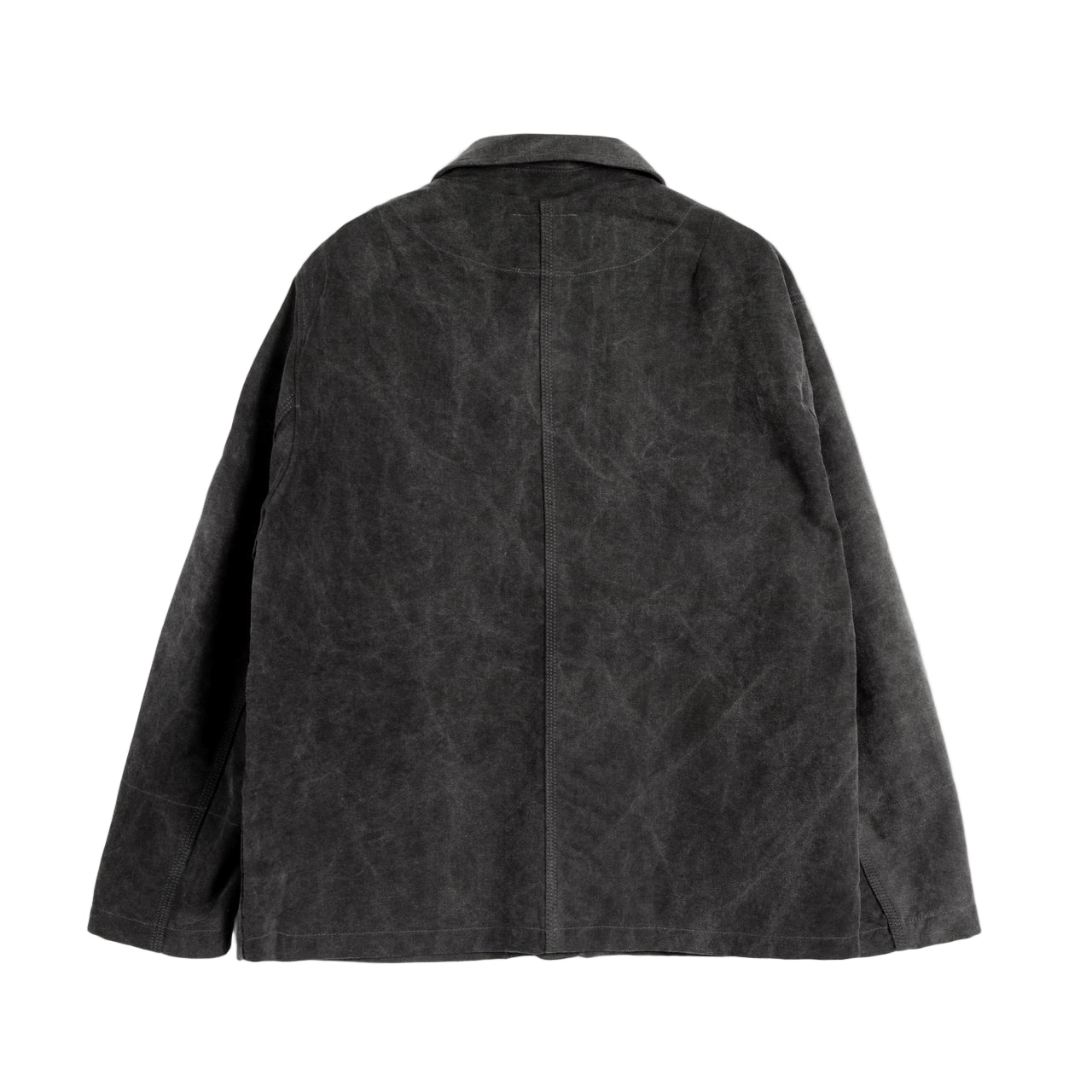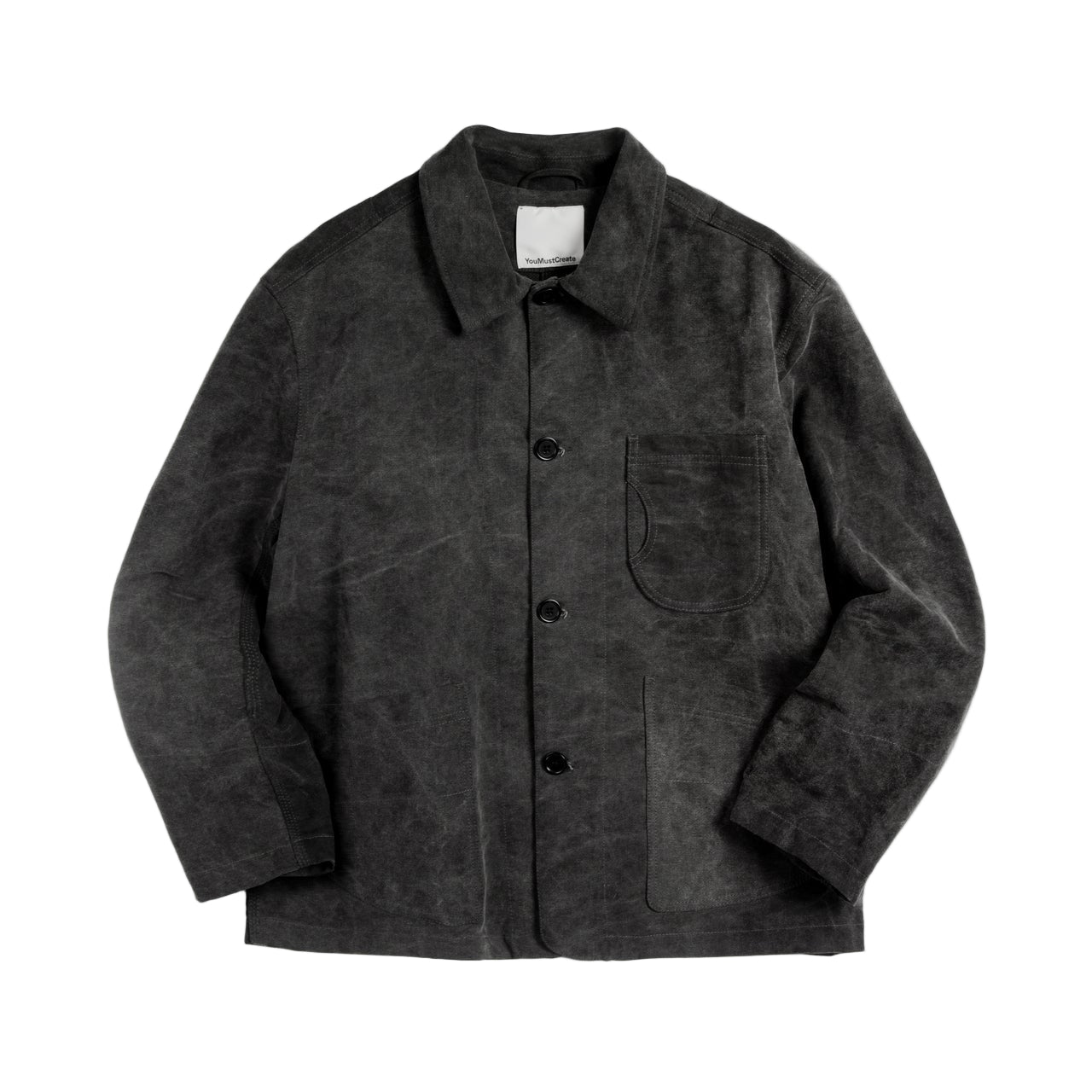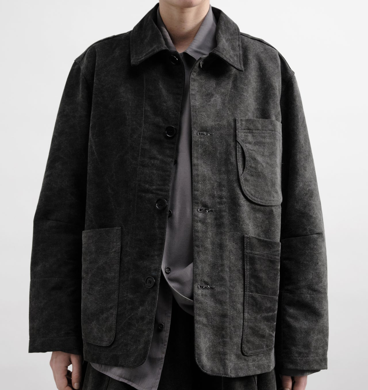 Constructed chore jacketCotton Delavè fabricShower repellent finishDual entry chest patch pocketsLower patch pocketsArticulated sleeve with elbow dartCorozo button fasteningUnisex cut
